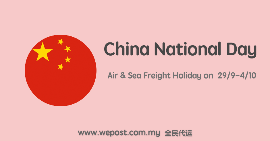 Below is our notice for holiday - Mooncake Festival & China National Day: 1. 30/9 -4/10 Air & Sea Department OFF 2. 29-30/9 Warehouse normal operation 3. 1 - 4/10 Customer Service OFF