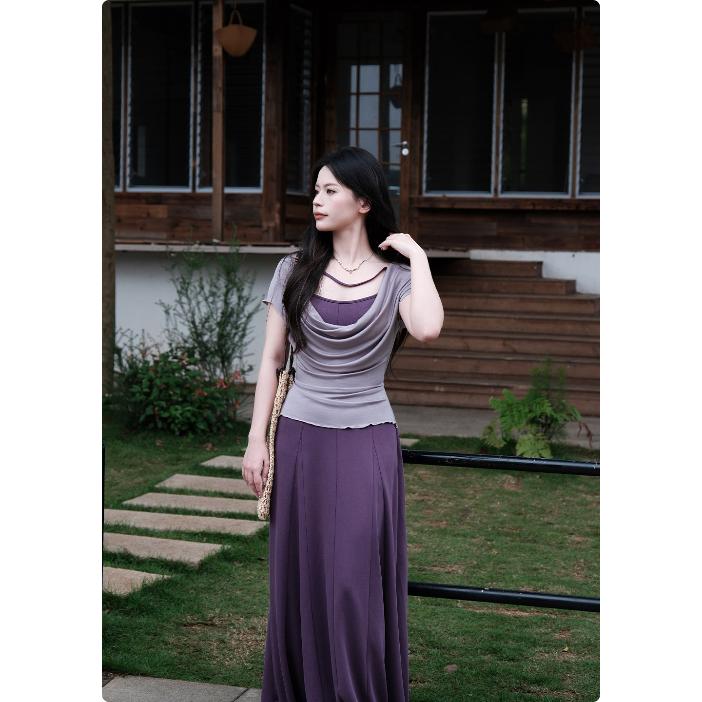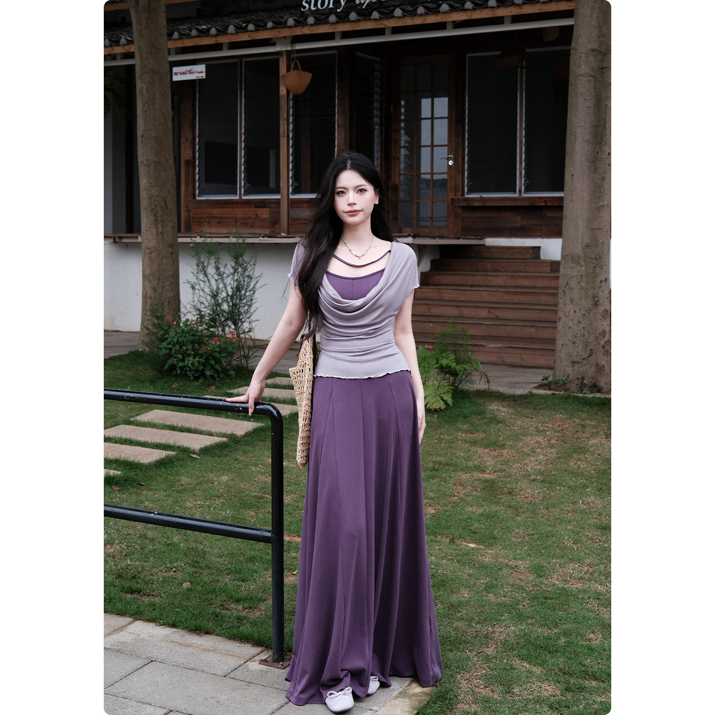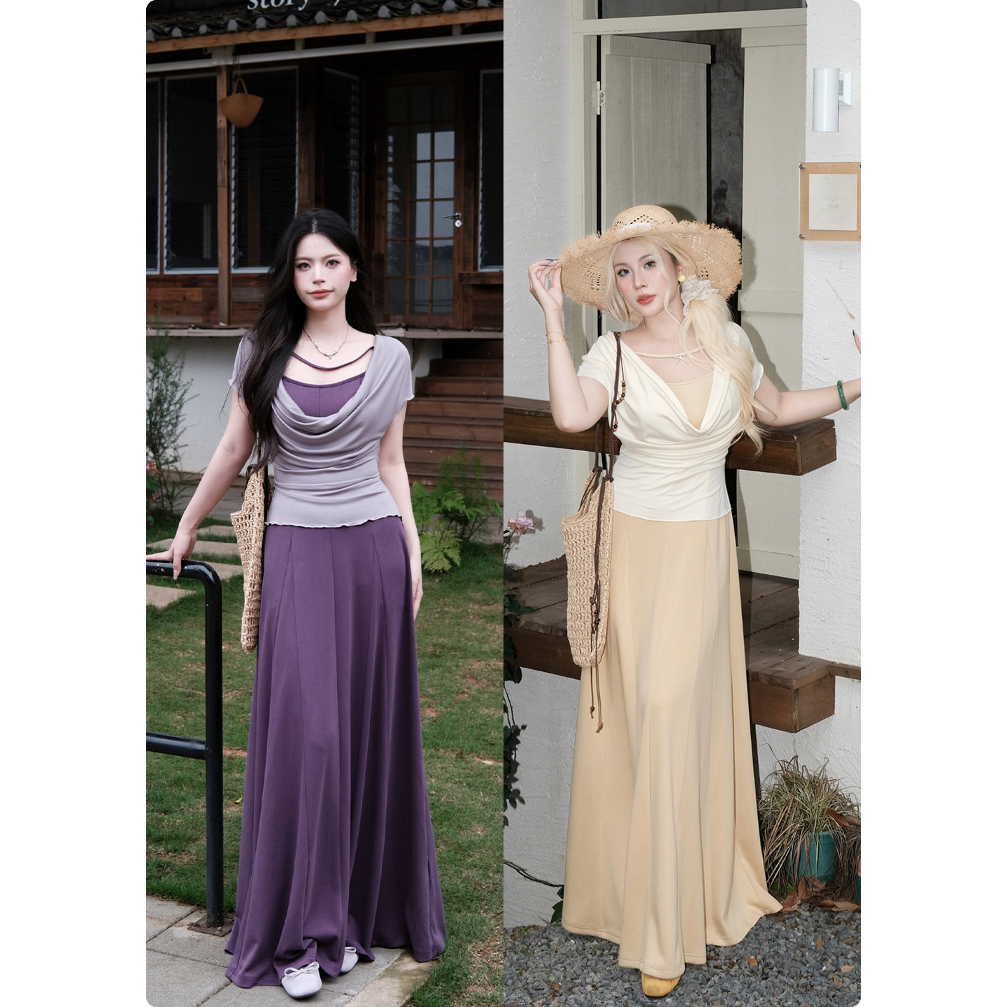 糯米子[四月物语]荡领假两件拼接长裙子微胖大码显瘦冰凉感连衣裙