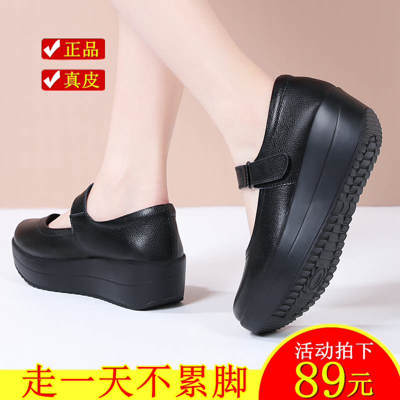 真皮女单鞋中跟浅口松糕女鞋厚底摇摇工作鞋黑色妈妈凉鞋春夏秋款
