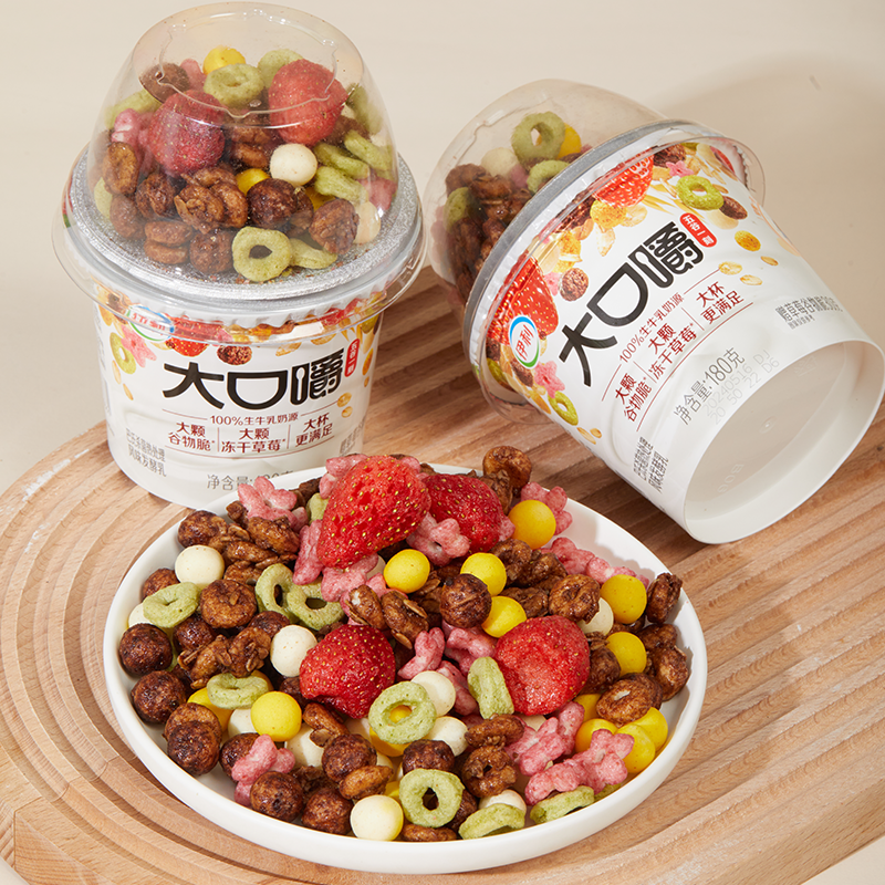 伊利大口嚼风味发酵乳180g*16杯生牛乳学生早餐冻干草莓谷物整箱