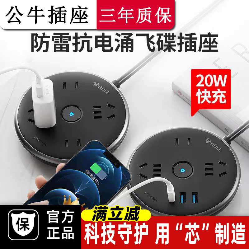 公牛飞碟插座多用usb快充防雷智能多功能家用插线板桌面插板插排
