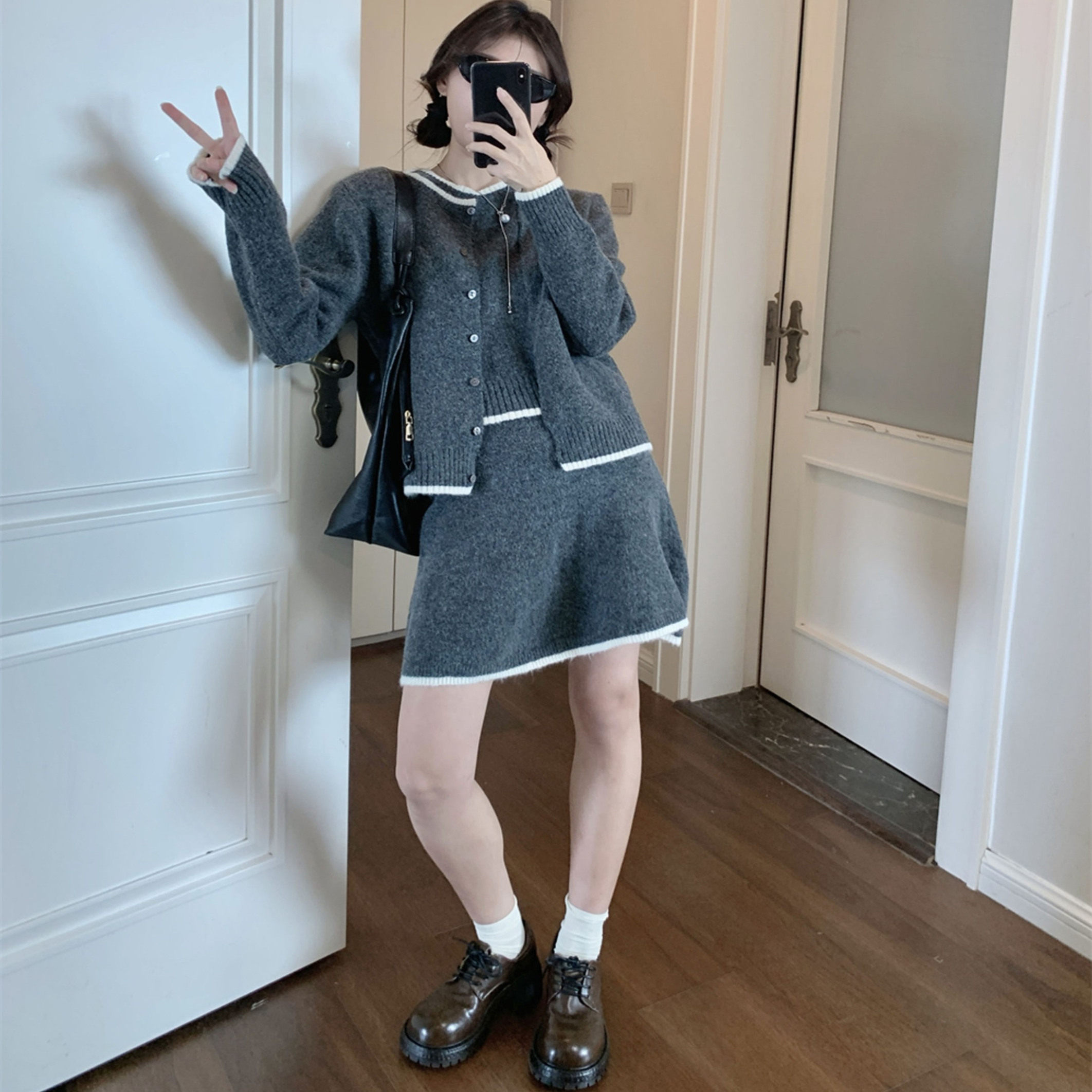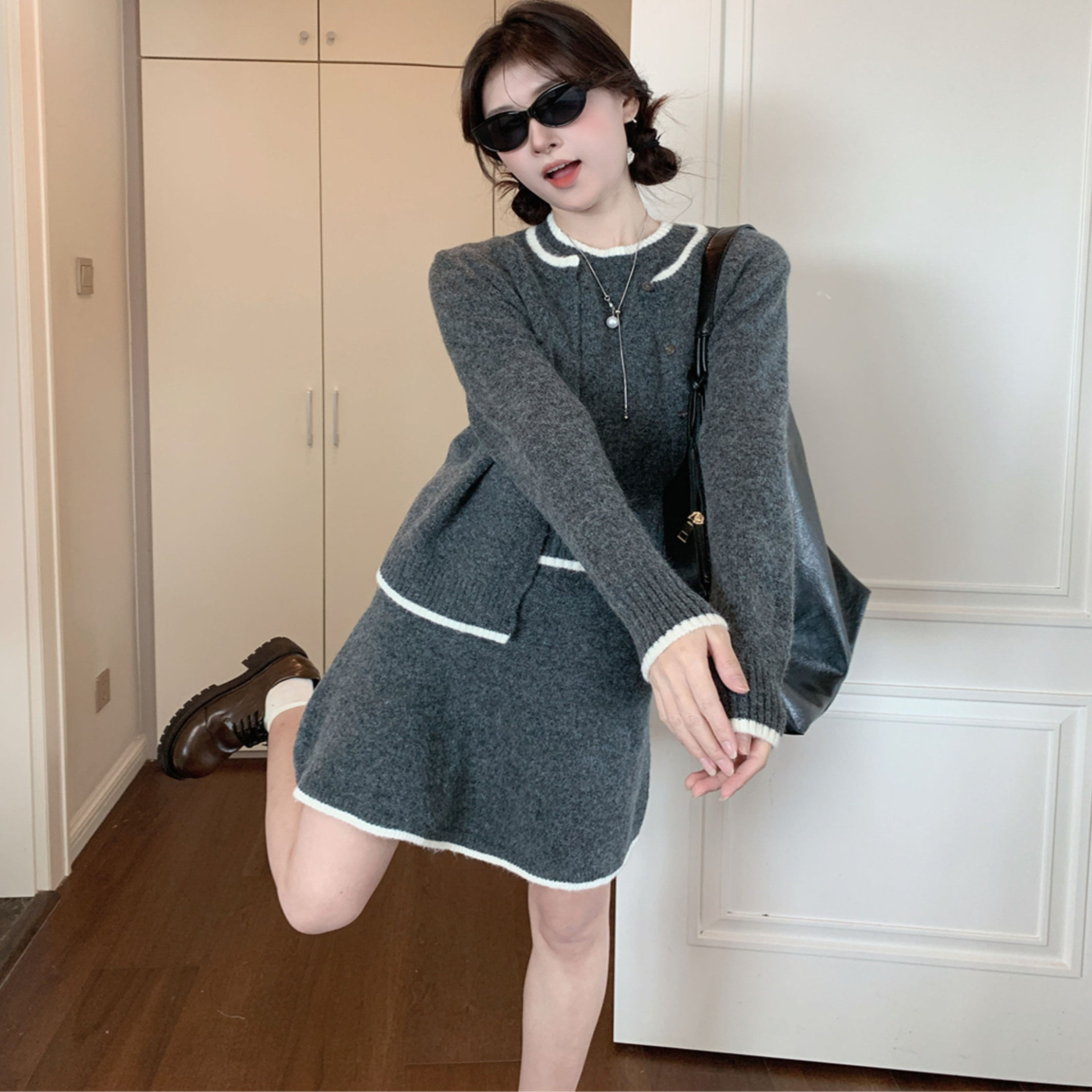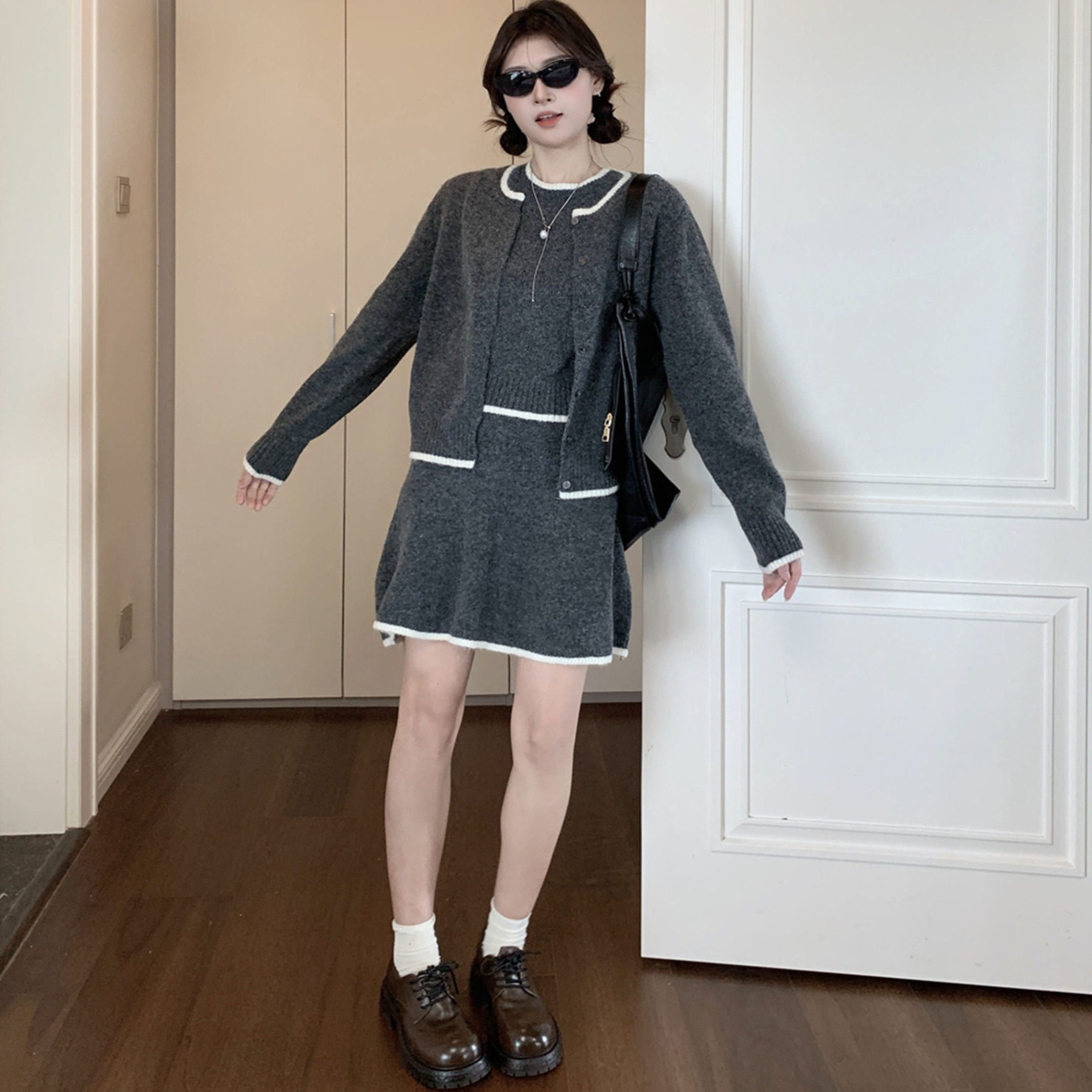 小香风毛衣套装女秋冬撞色边针织开衫+上衣+半身裙三件套