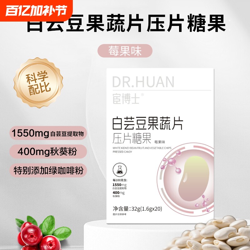 宦博士白芸豆果蔬餐前片32g/盒莓果味秋葵粉山竹压片糖果小包装