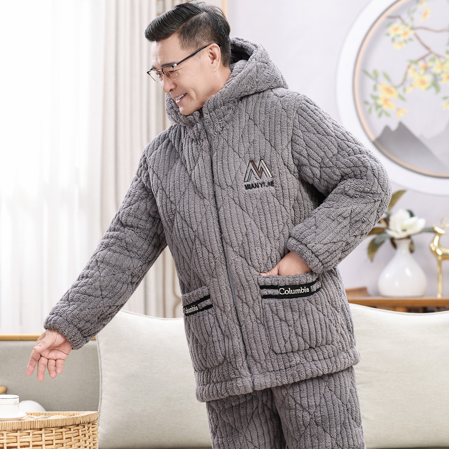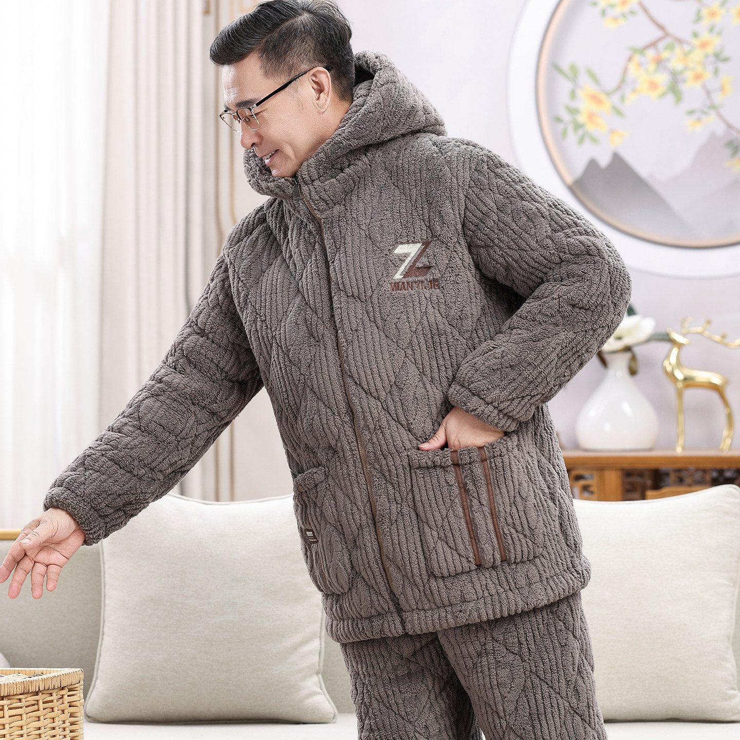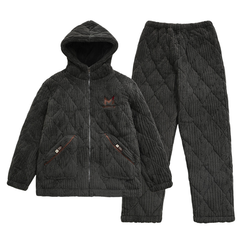 爸爸睡衣冬季三层加厚珊瑚绒夹棉袄超保暖中老年男士秋冬款家居服
