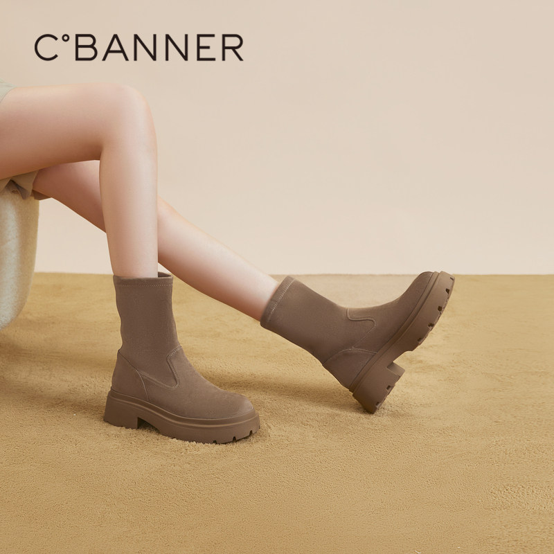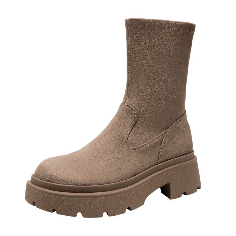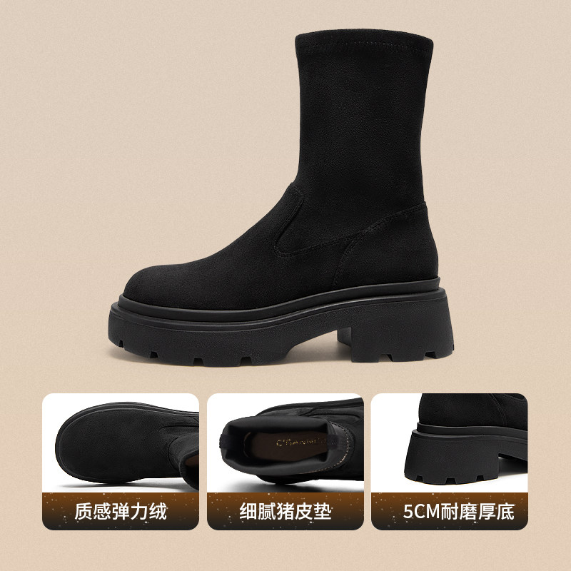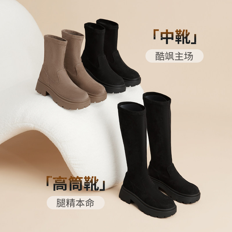 千百度厚底弹力靴袜靴新款秋冬瘦瘦靴中筒女鞋棕色美拉德短靴