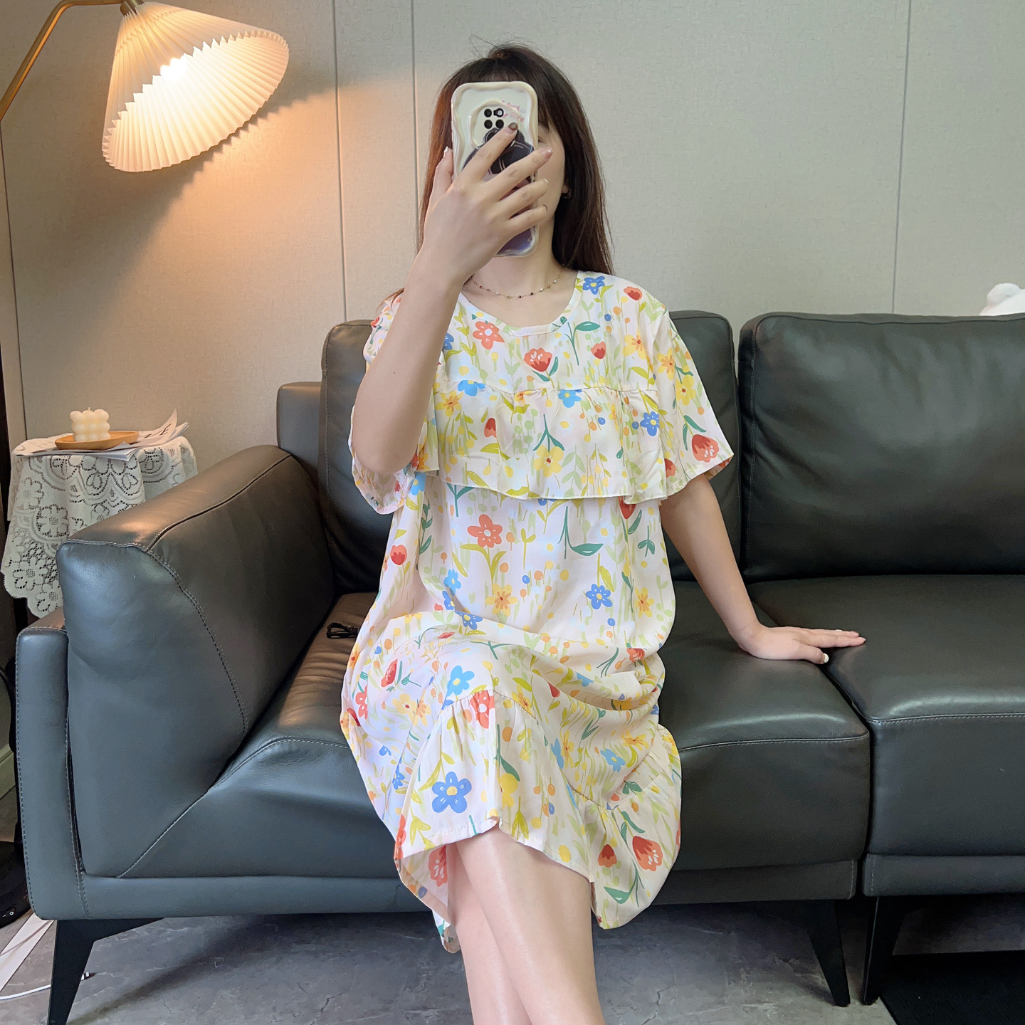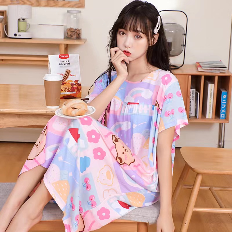 大码睡裙夏季绵绸宽松女士睡衣短袖家居长裙子棉绸薄款连衣裙