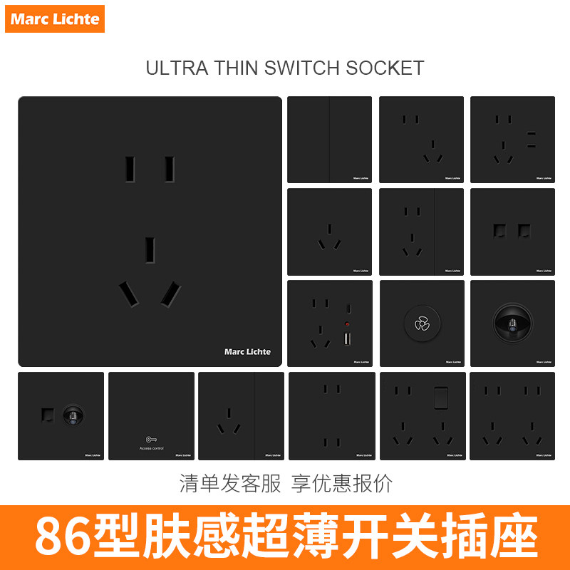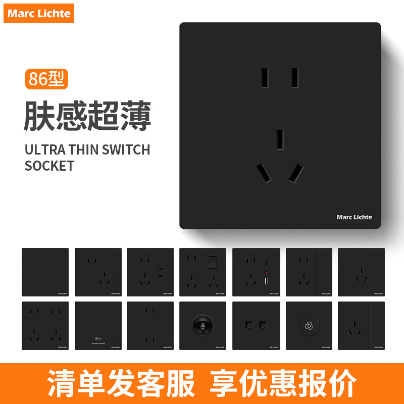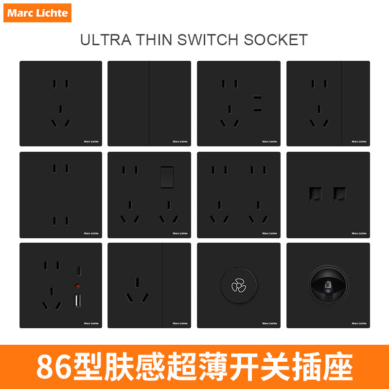 肤感黑色家用磨砂超薄哑光开关插座面板86型五5孔一开双控暗装