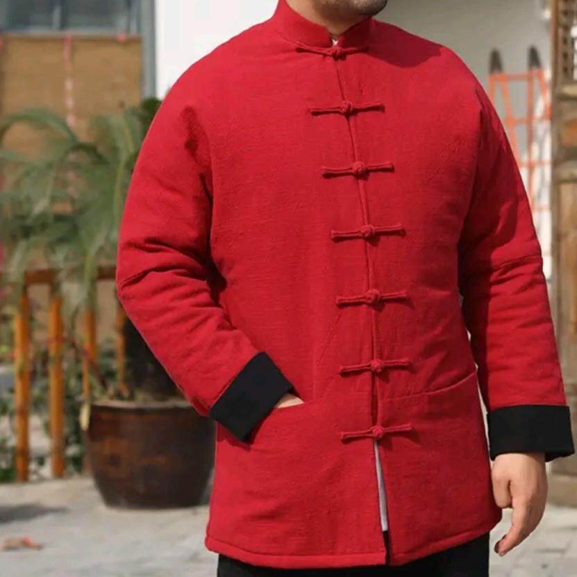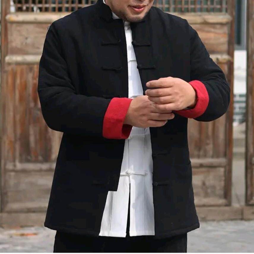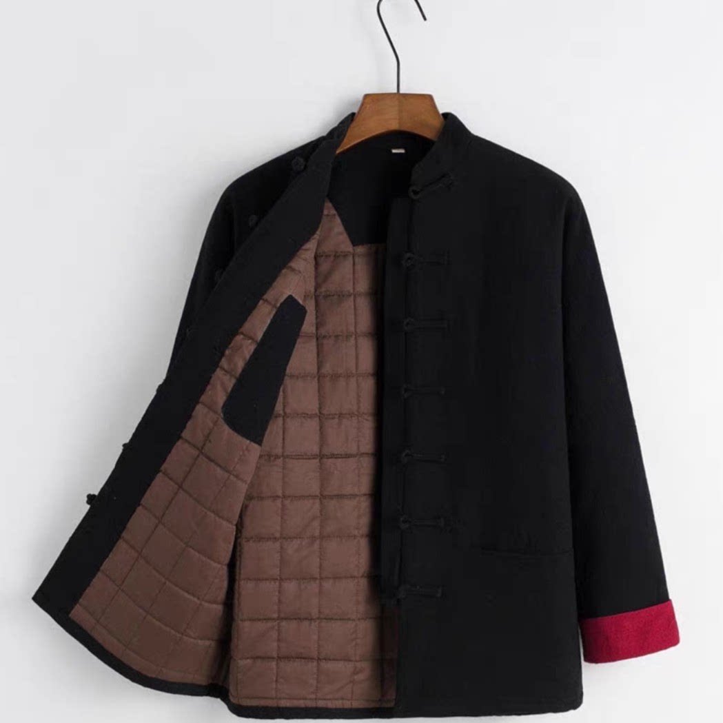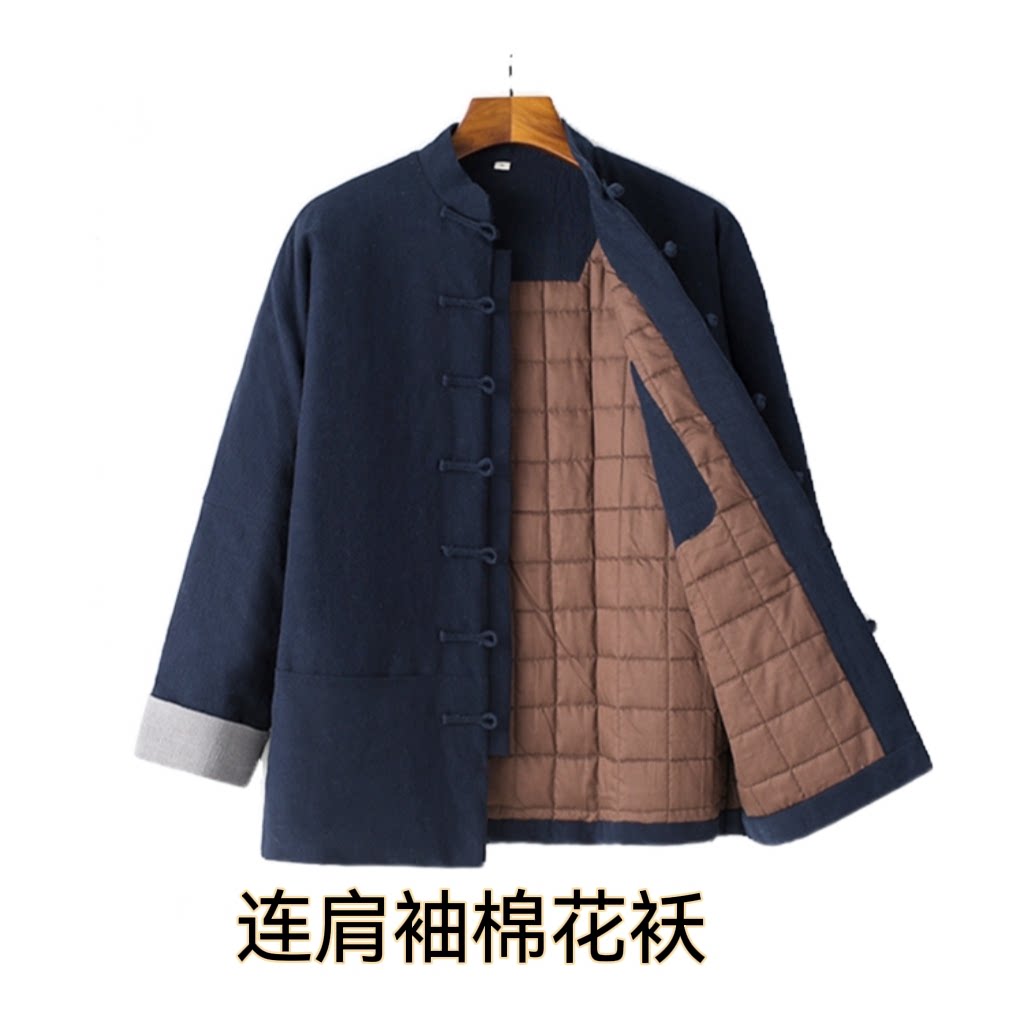唐装男士连肩袖棉花棉袄+棉裤亚麻冬季加厚棉服盘扣对襟复古棉衣