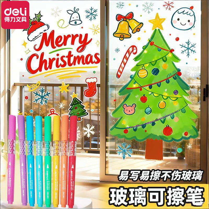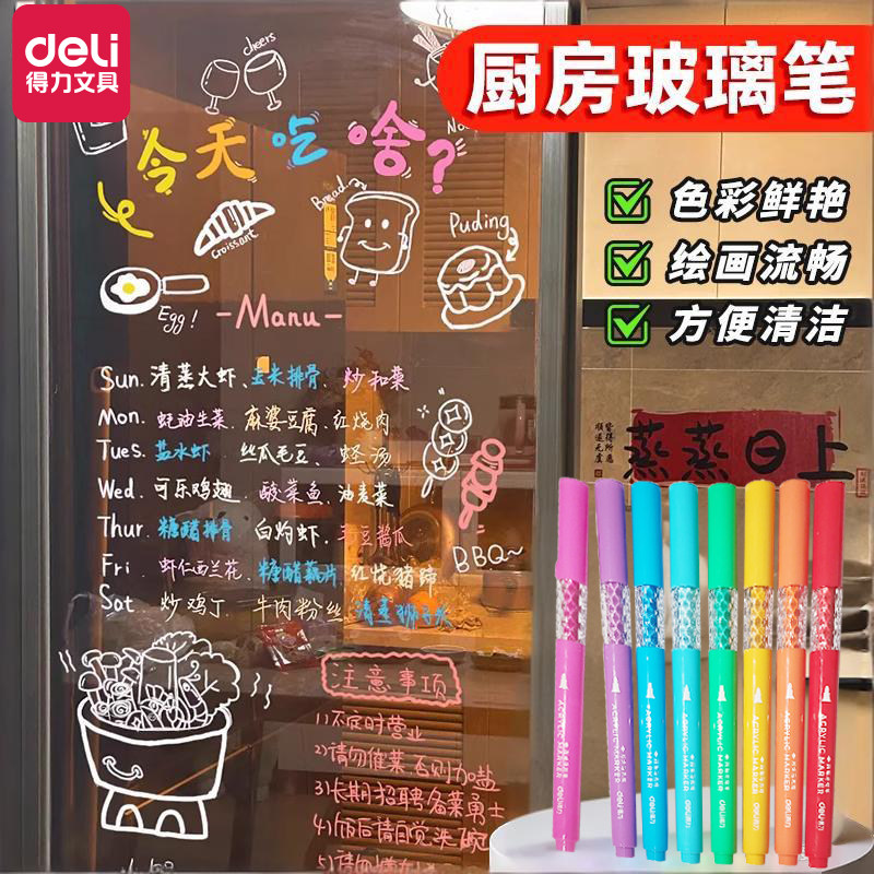 得力春节玻璃可擦笔丙烯马克笔玻璃门氛围装饰涂鸦绘画液体海报玻璃门黑板镜面彩色荧光板亚克力橱窗专用笔