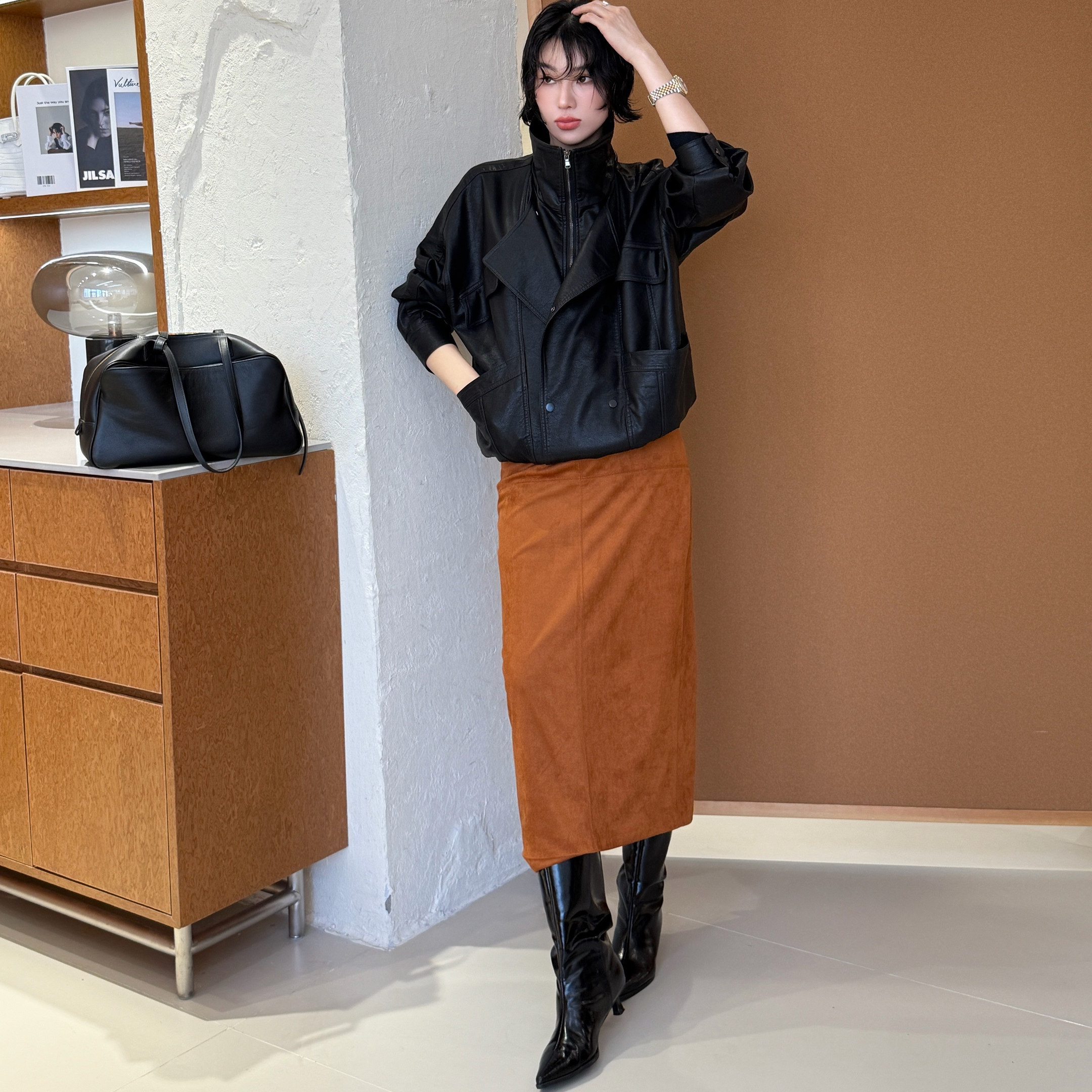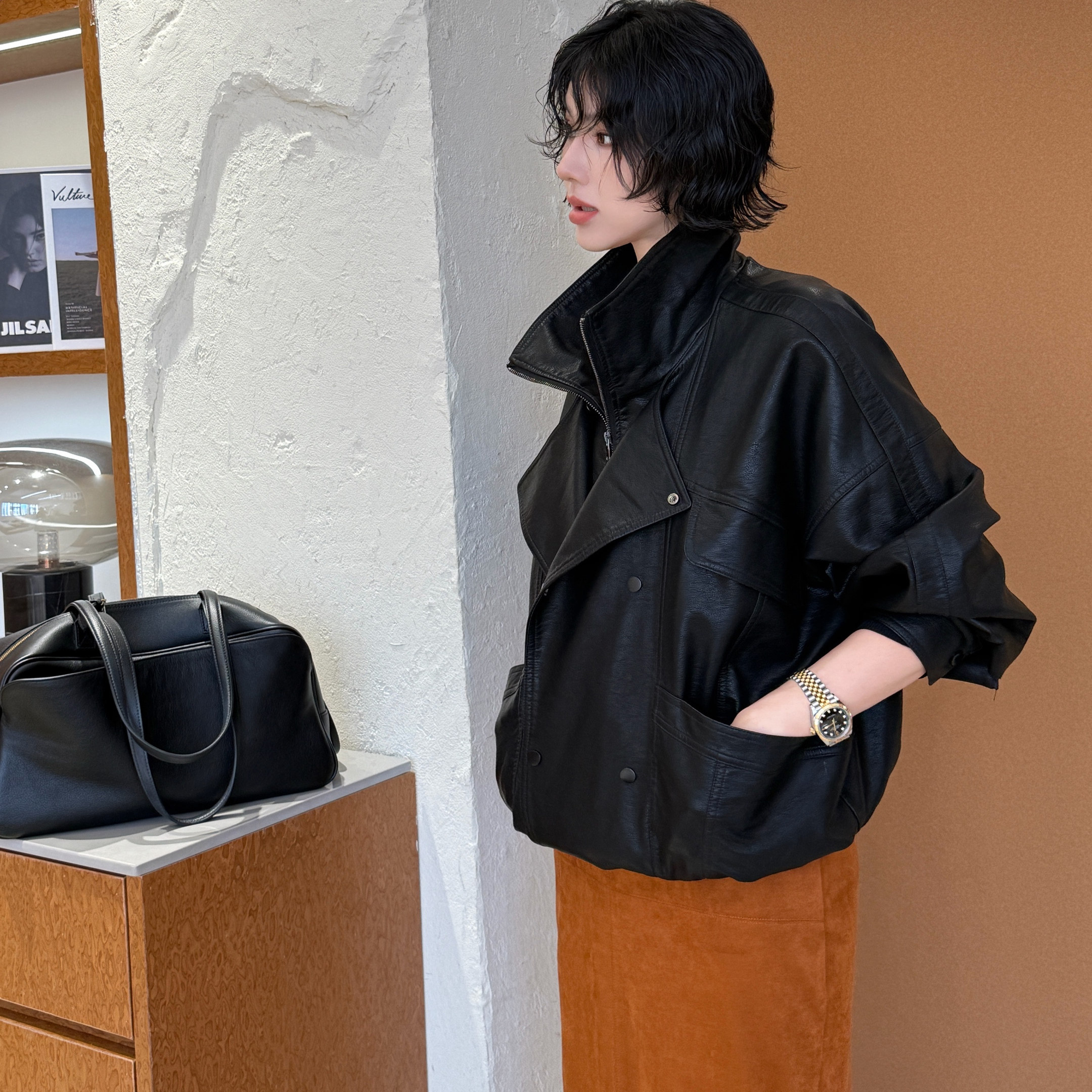 Z.VANLU时髦出街 又A又飒 复古翻领宽松廓形夹克皮衣黑色外套女士