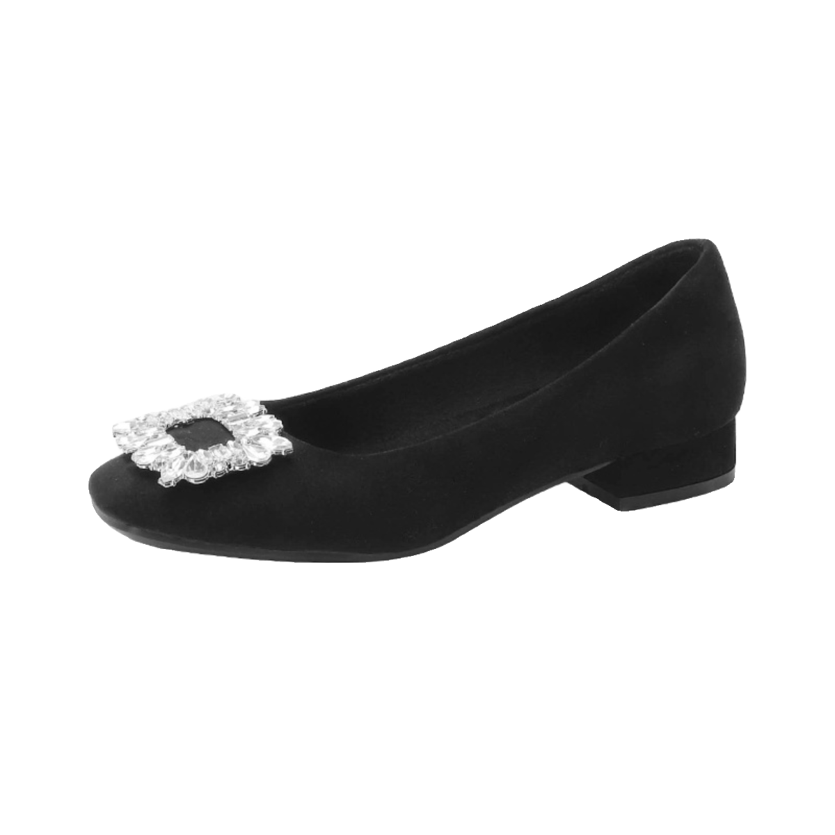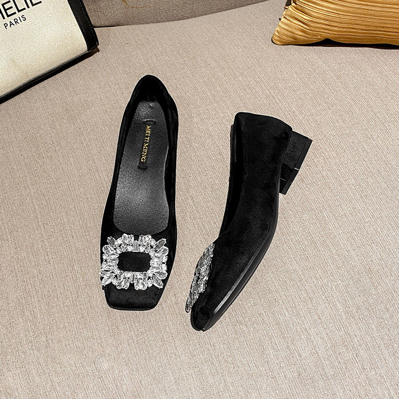 低跟方头单鞋女2025年春季新款绒面水钻方扣职业上班工作鞋女黑色