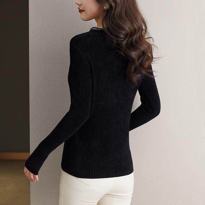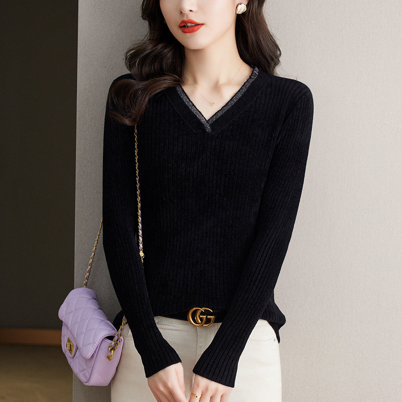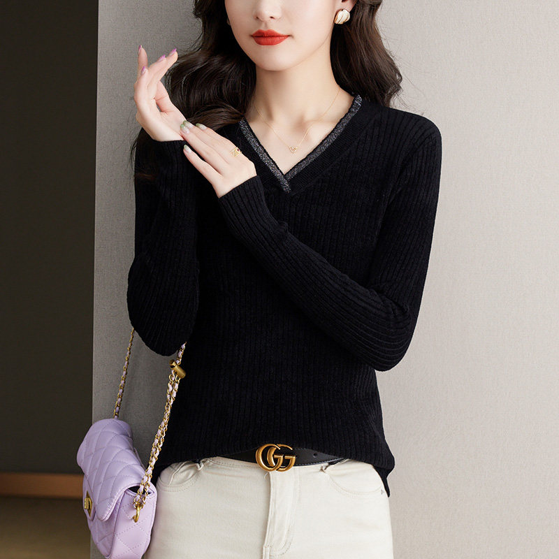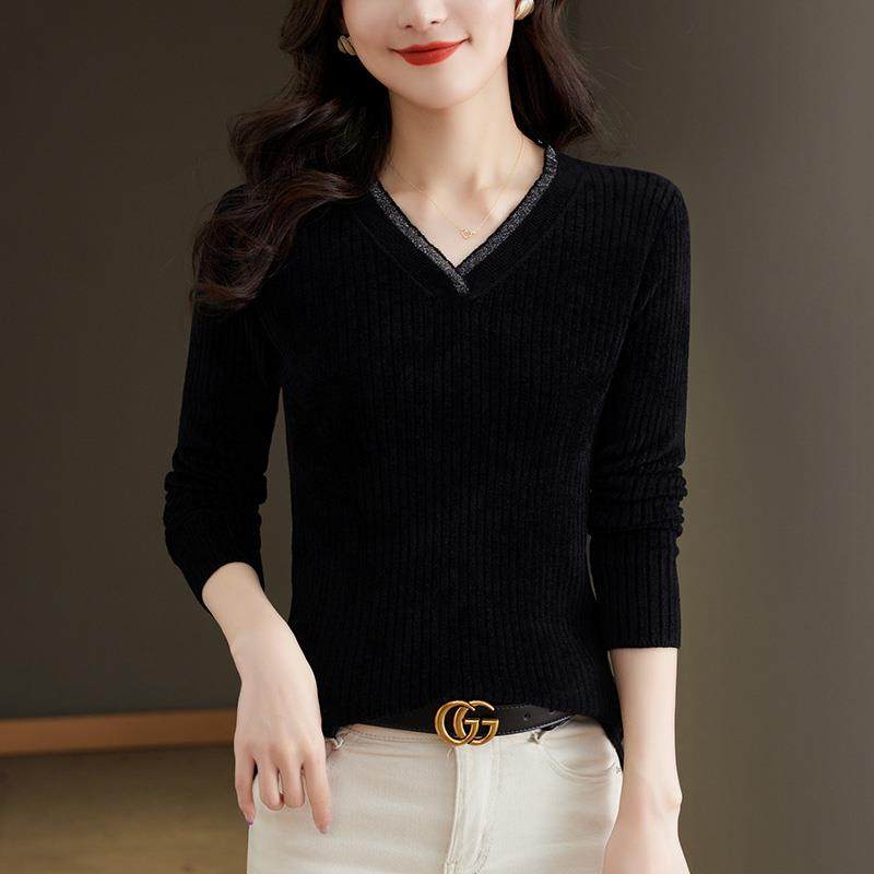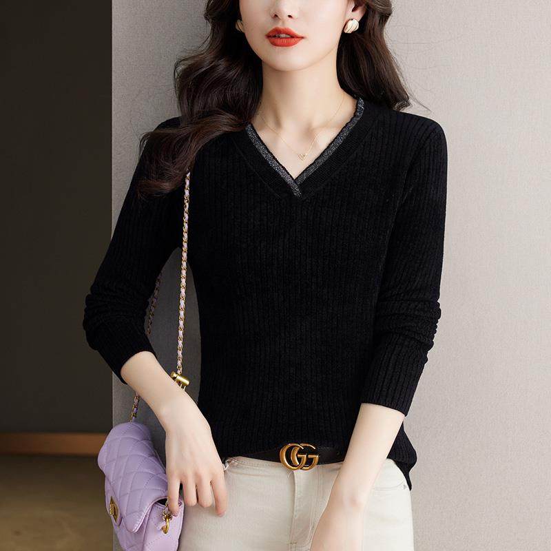 天鹅绒V领打底衫女士内搭秋冬2024新款针织上衣中年妈妈黑色毛衣