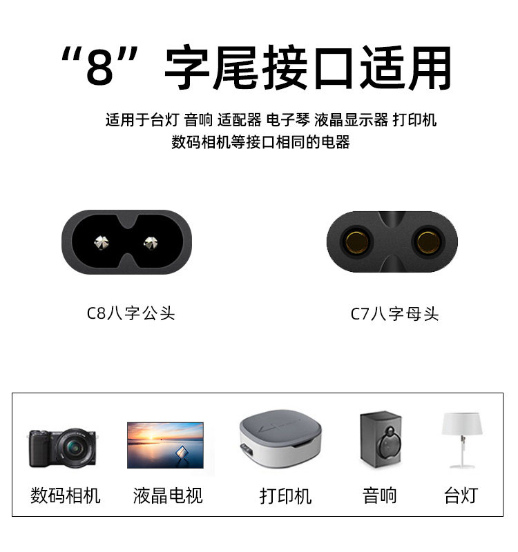 IEC320 C7转C8带开关电源线延长线2芯两孔8字尾公对母C7-C8对接线
