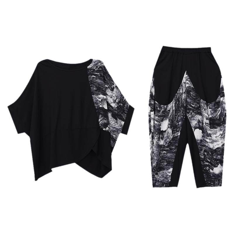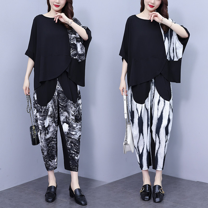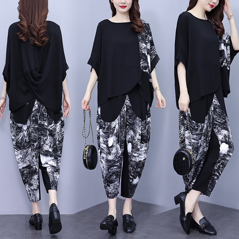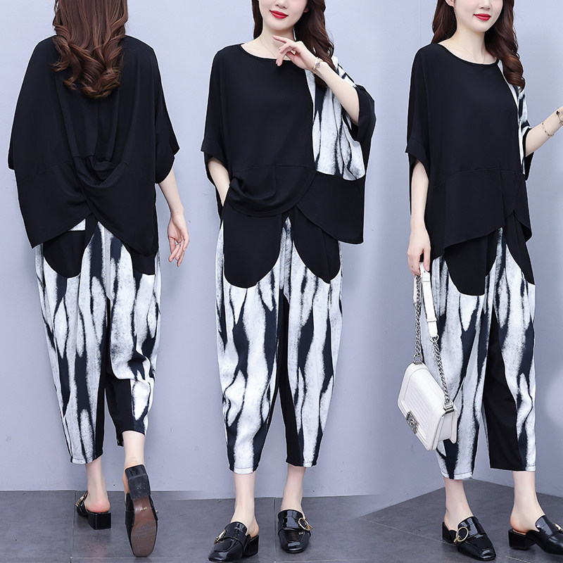 夏季女士短袖套头+灯笼裤哈伦两件套女2026薄款印花大码休闲套装
