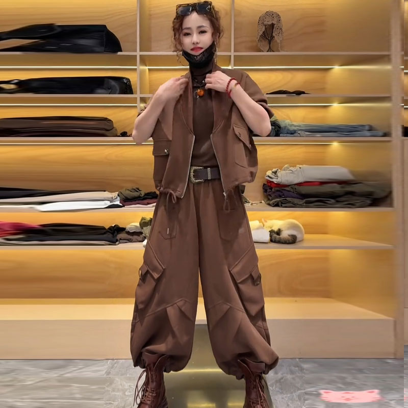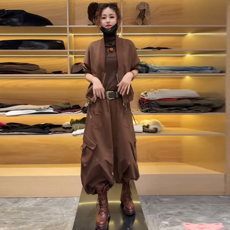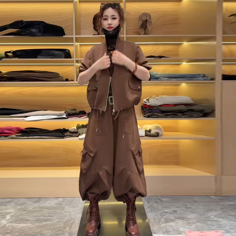 欧货时尚个性大码套装女秋装新款拉链V领收绳外套上衣+灯笼九分裤
