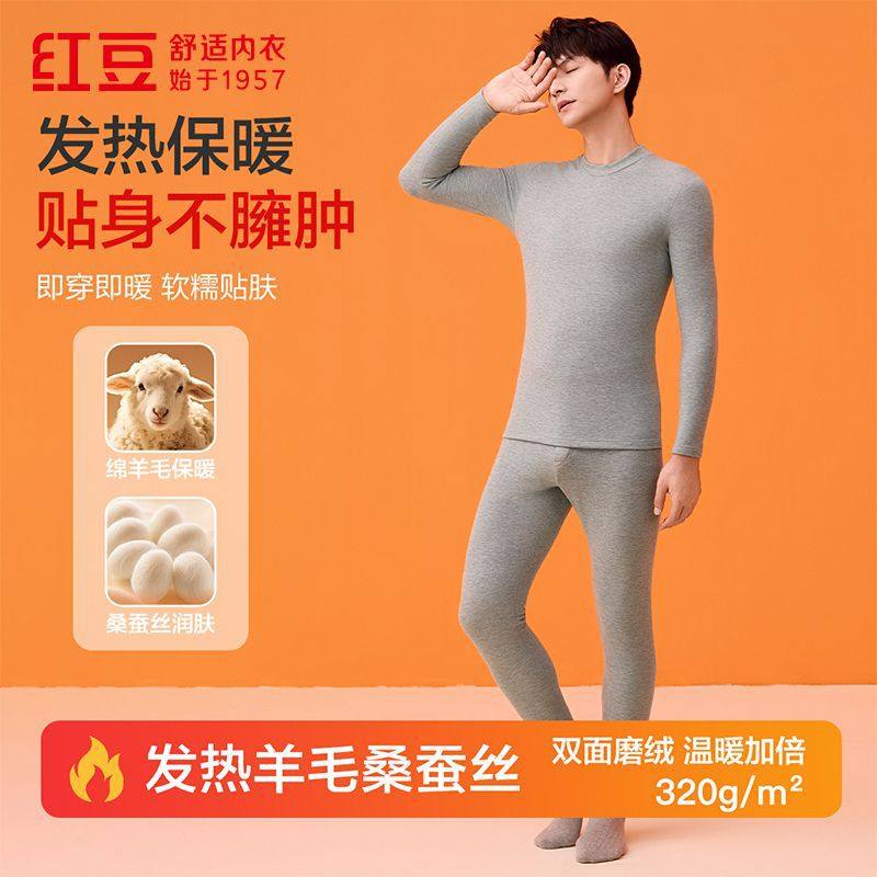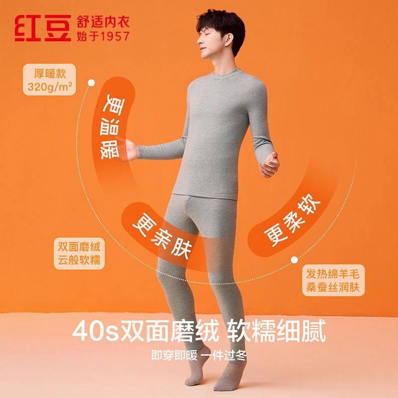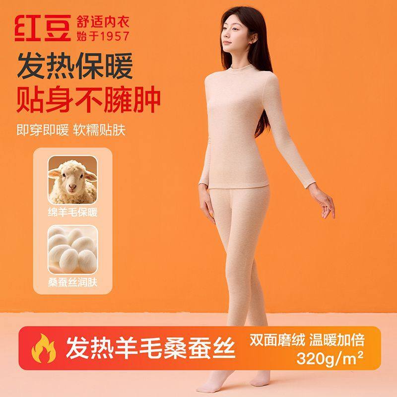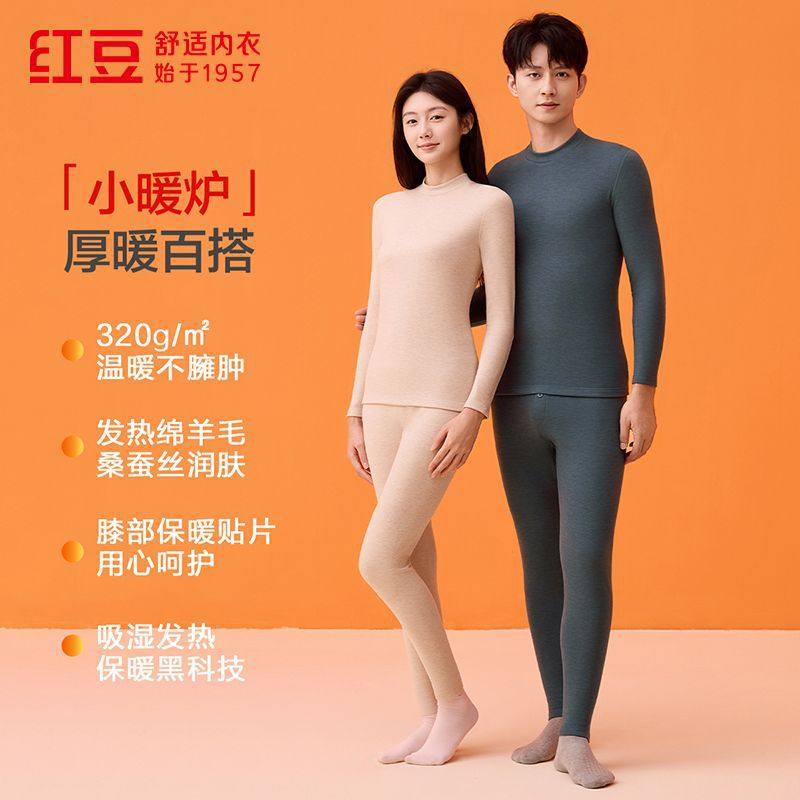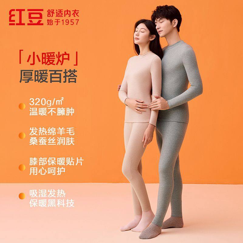 红豆发热羊毛保暖内衣男女士冬季双面磨绒带护膝加厚秋衣秋裤套装