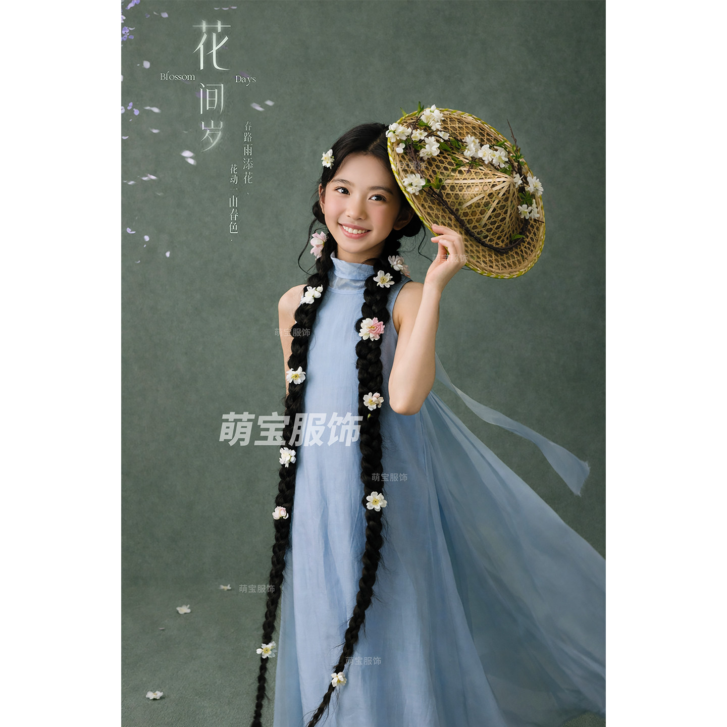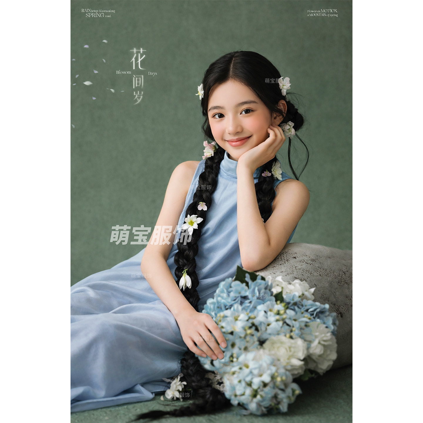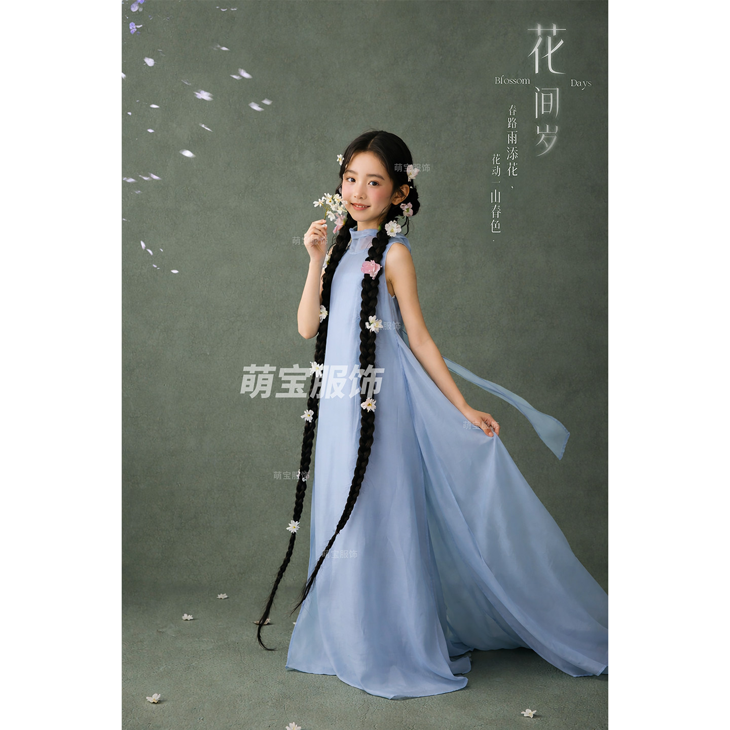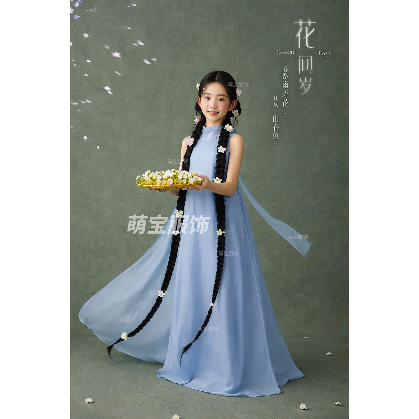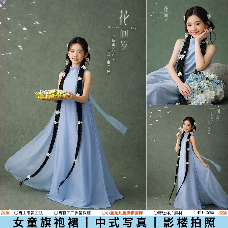 儿童摄影新中式蓝色旗袍连衣裙女童国风影楼拍照服装女孩艺术照