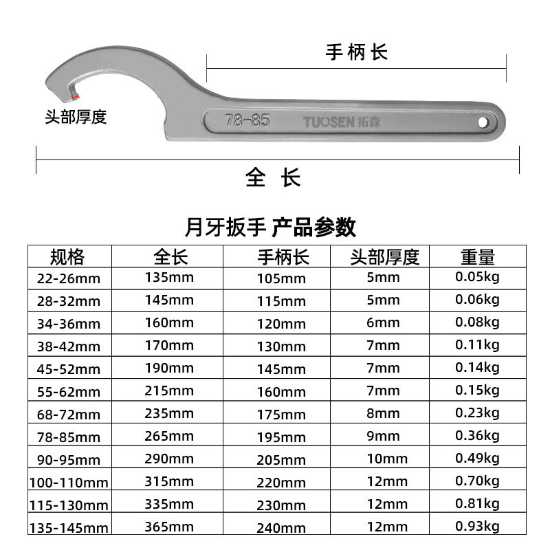 拓森勾头扳手45-52水表盖钩形工具多功能78-85水表扳手月牙扳手牙