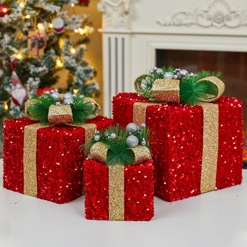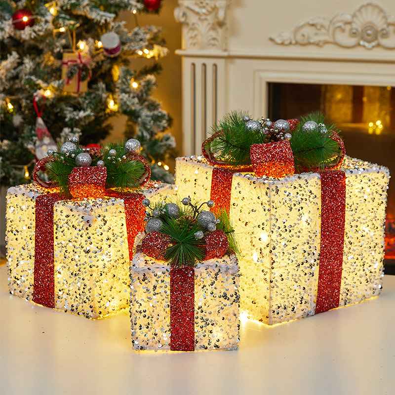 圣诞节发光亮片礼物盒橱窗装饰美陈圣诞树下礼盒三件套礼品盒摆件