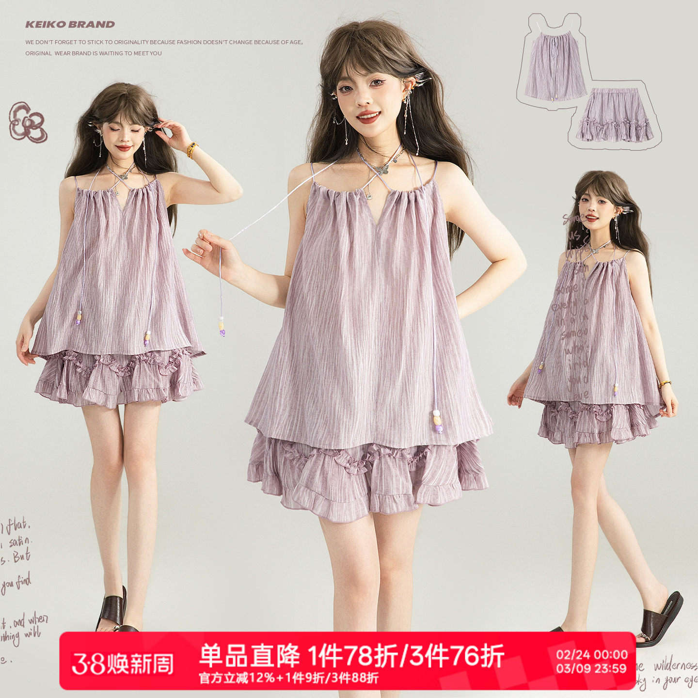 KEIKO盐系轻熟紫色穿搭两件套装巨好看的肌理扎染吊带上衣+半身裙