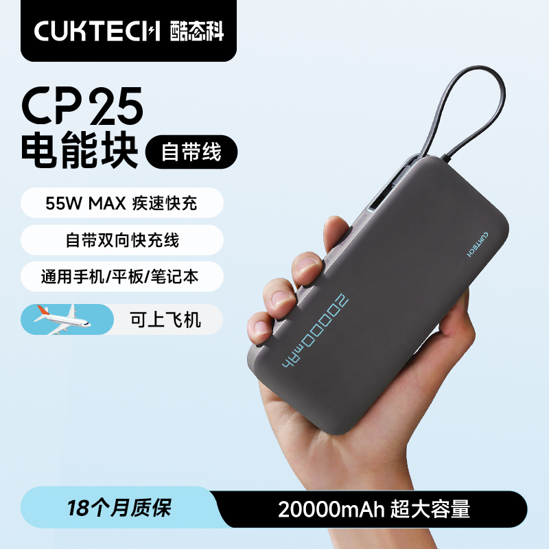 CUKTECH酷态科2025年新款充电宝CP25电能块大容量自带线20000毫安便携移动电源PD快充适用于苹果iPhone16Pro