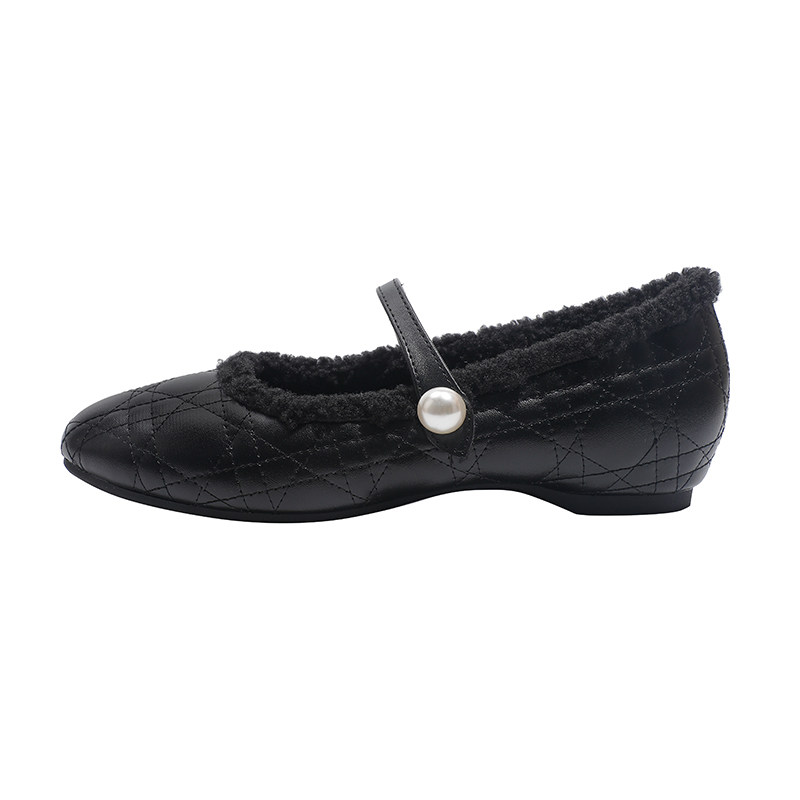 真皮~骄屿山茶花加绒玛丽珍鞋女秋冬新款小香风菱格珍珠毛毛单鞋