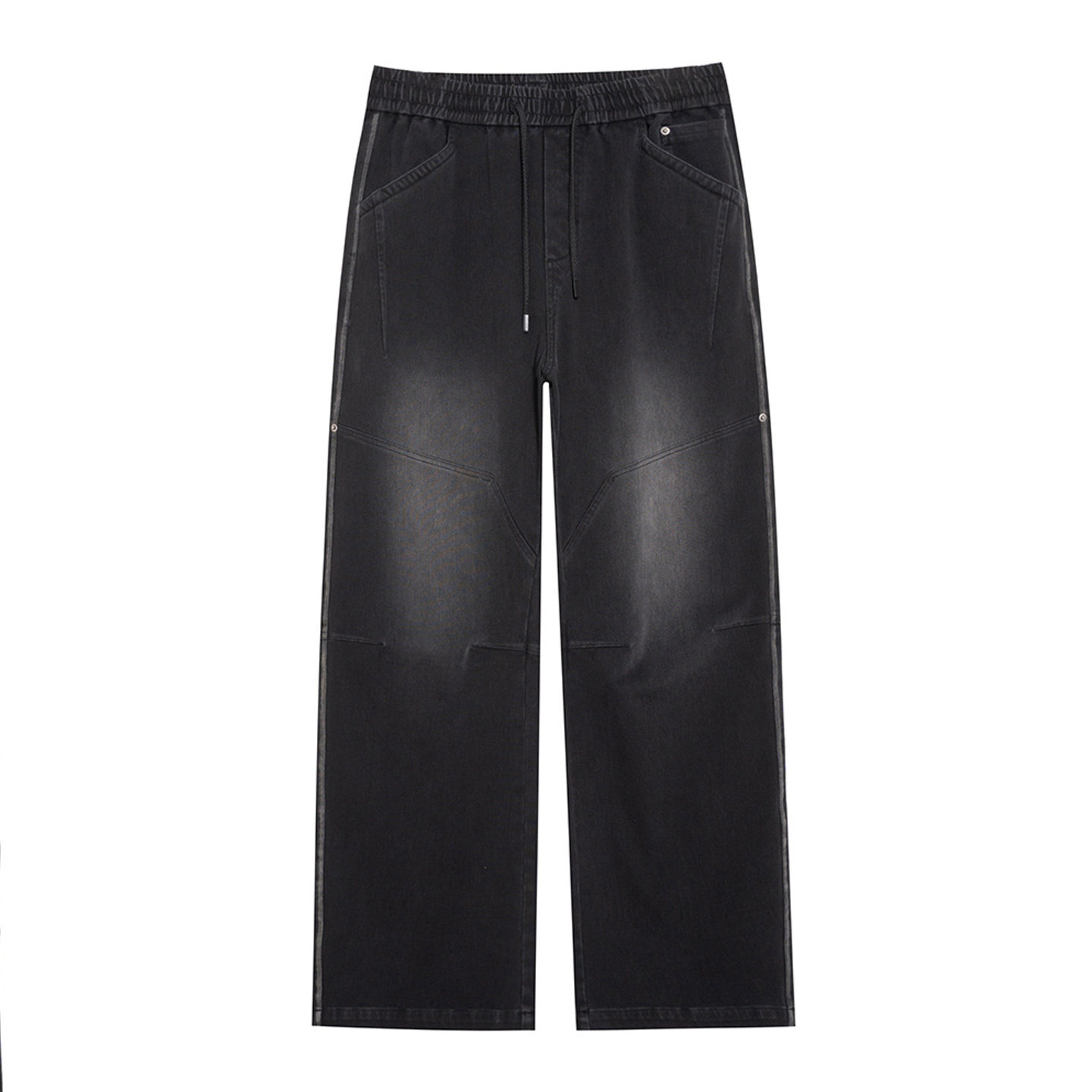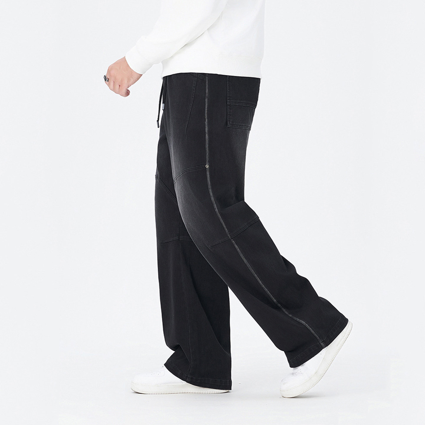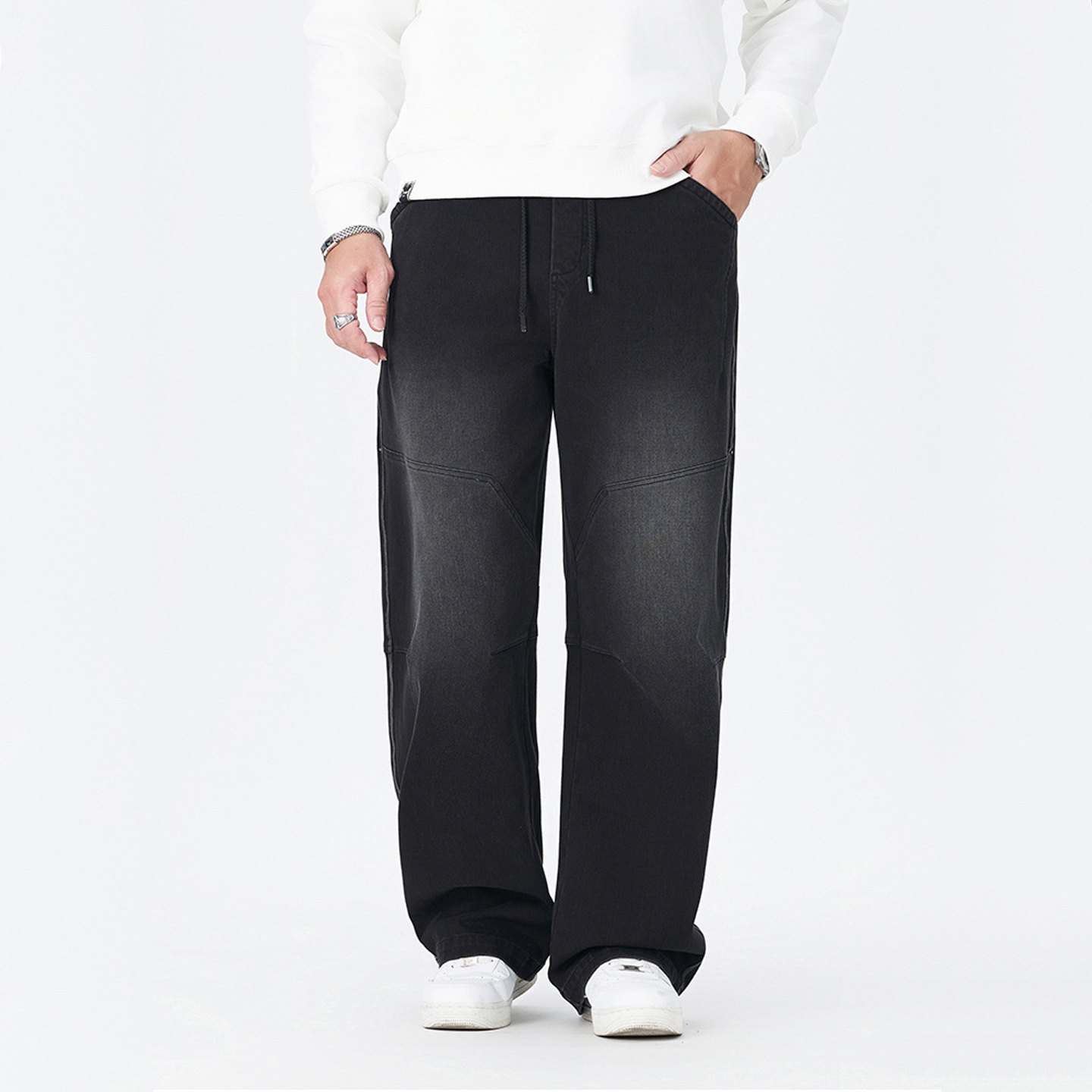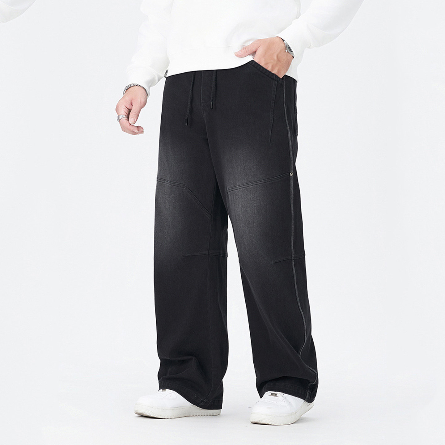 大码下装直筒牛仔裤秋季拼接做旧复古宽松加肥加大男式阔腿裤