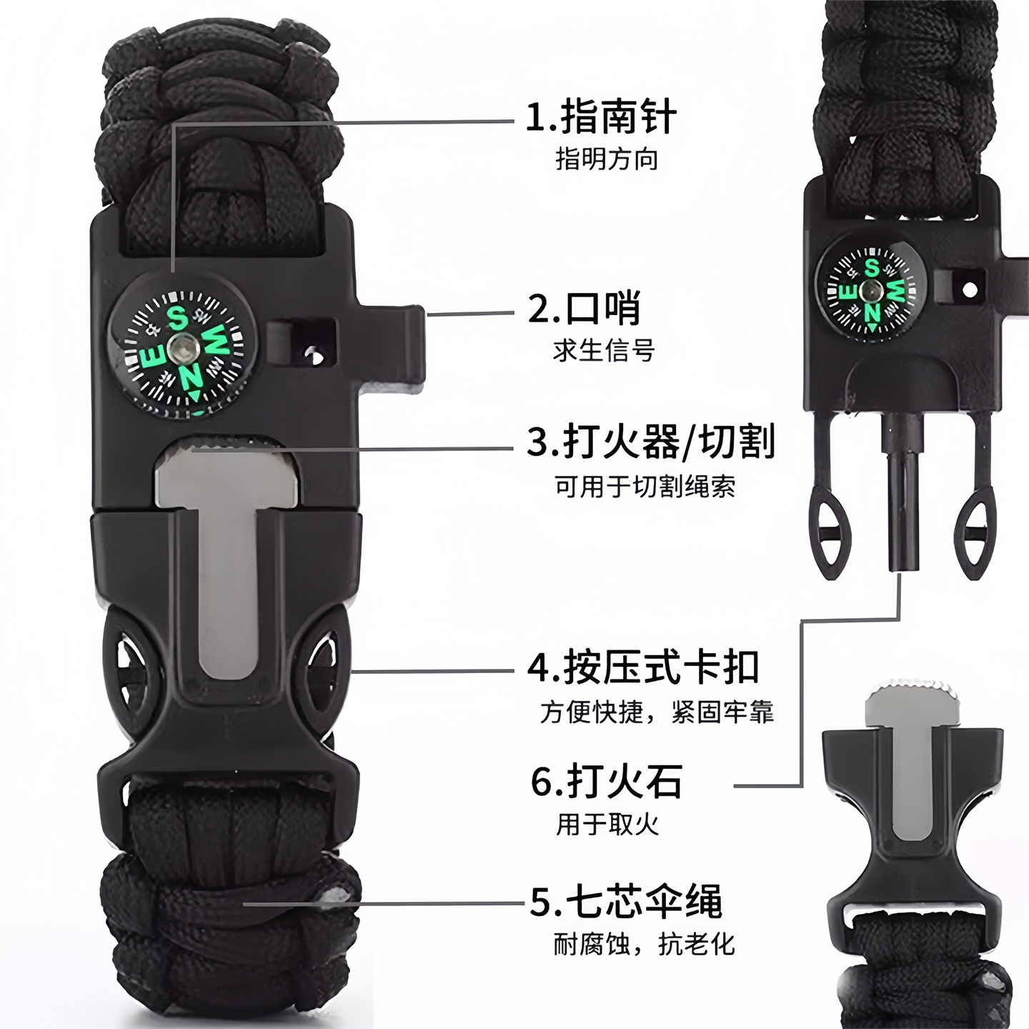 多功能户外伞绳手链打火石指南针登山救生手绳求救哨应急生存装备