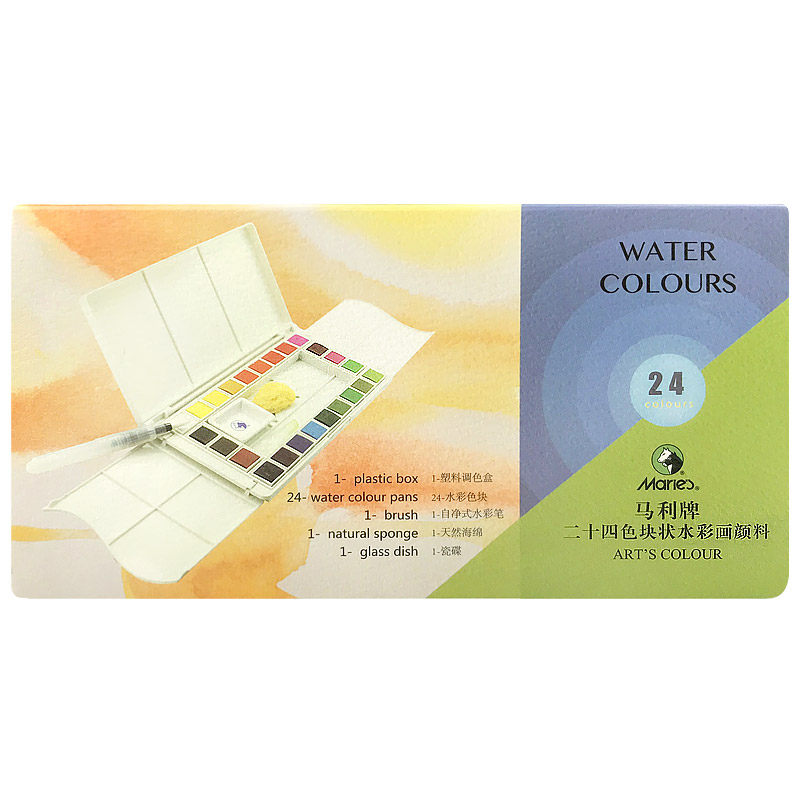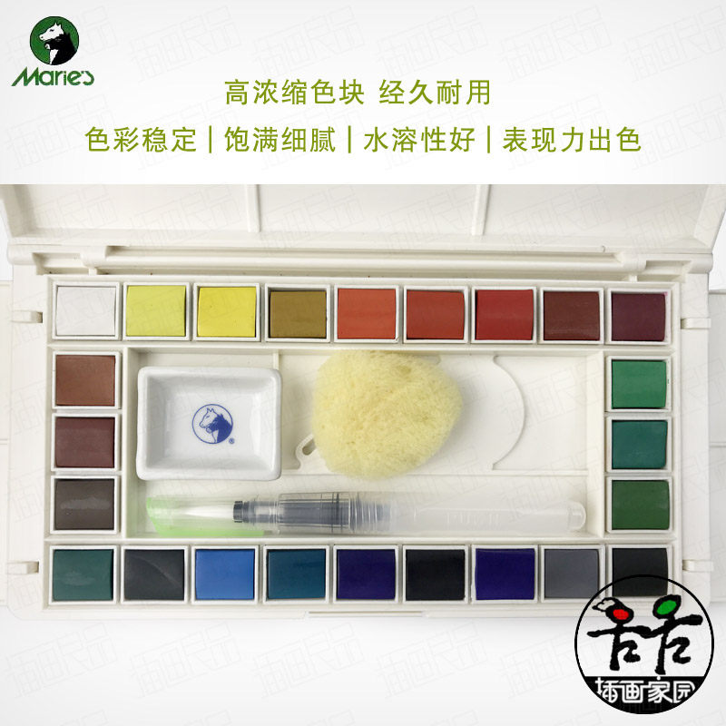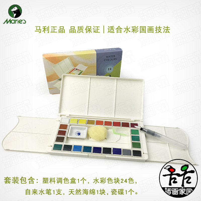 马利24色固体水彩便携套装 水彩国画颜料 色块 海绵 自来水笔