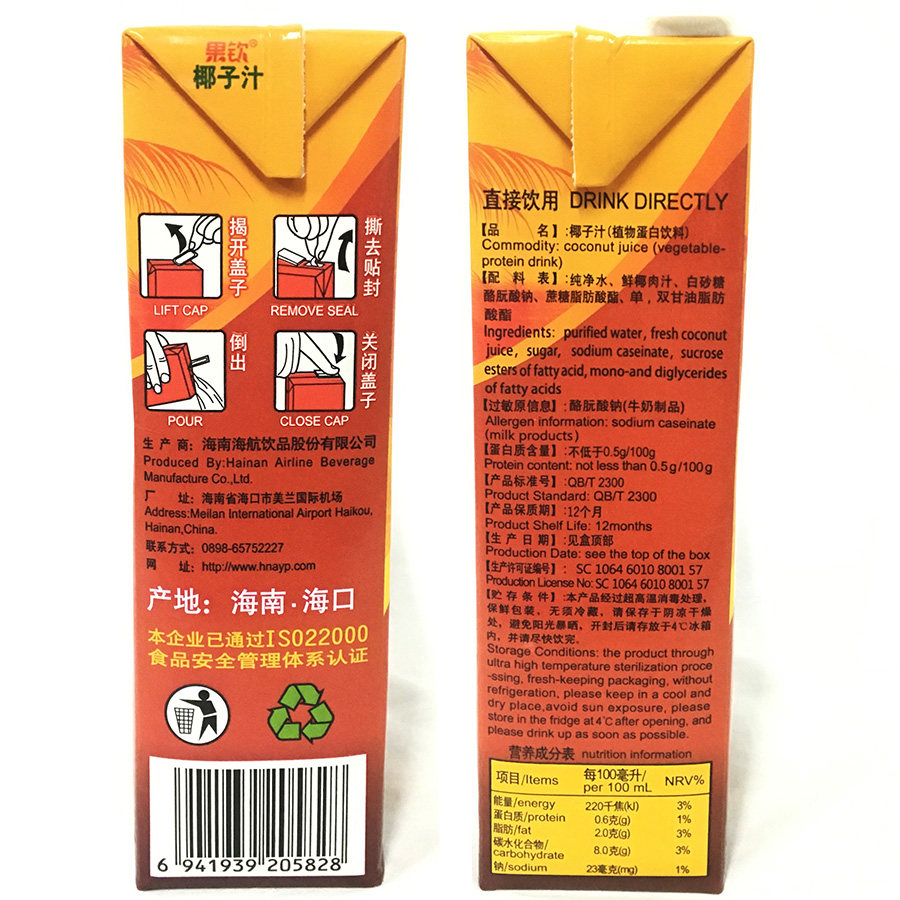 海航饮品椰子汁1L单瓶盒装植物蛋白奶鲜榨果汁蔬果味饮料飞机酒店