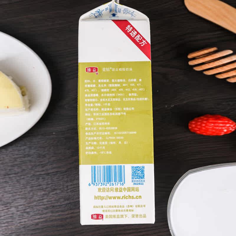 金钻植脂甜奶油 植物性淡奶油 蛋挞蛋糕裱花鲜奶油家用烘焙原料1L