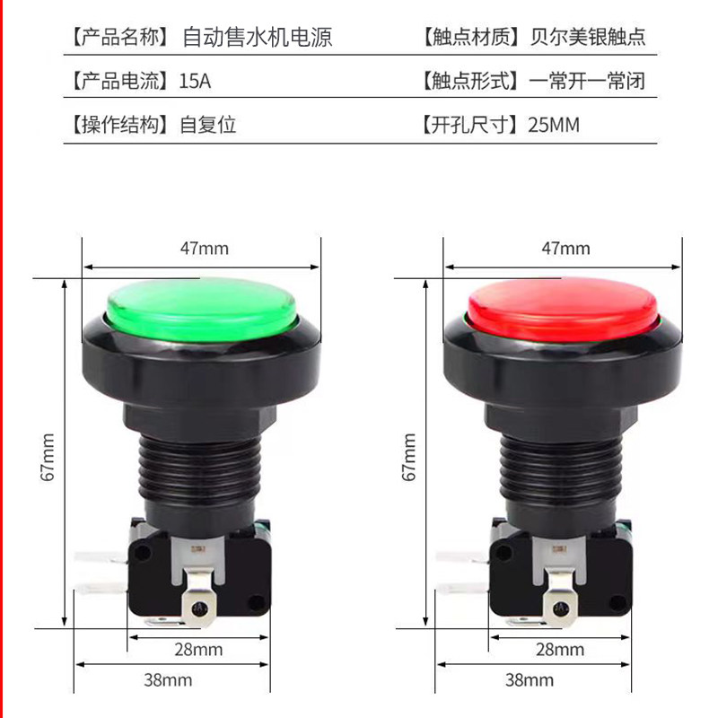 售水机开关按键开关灌装键按钮自动售水机暂停键红色绿色显指示灯