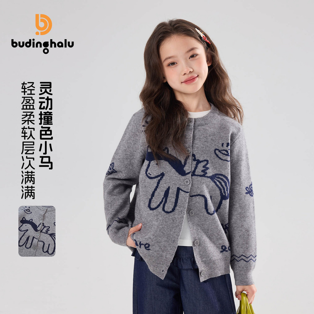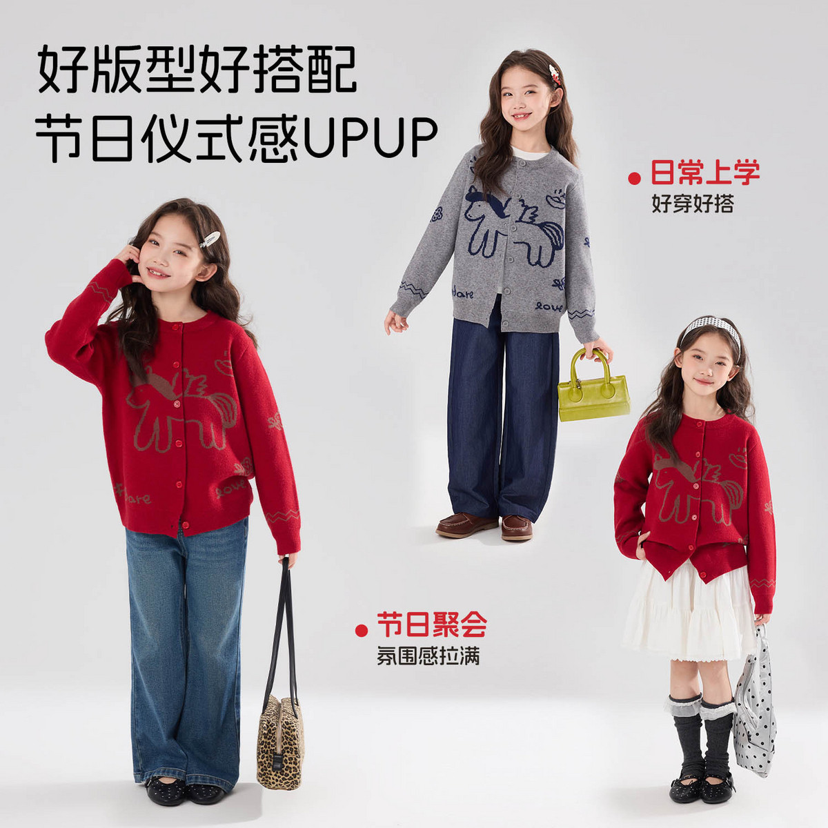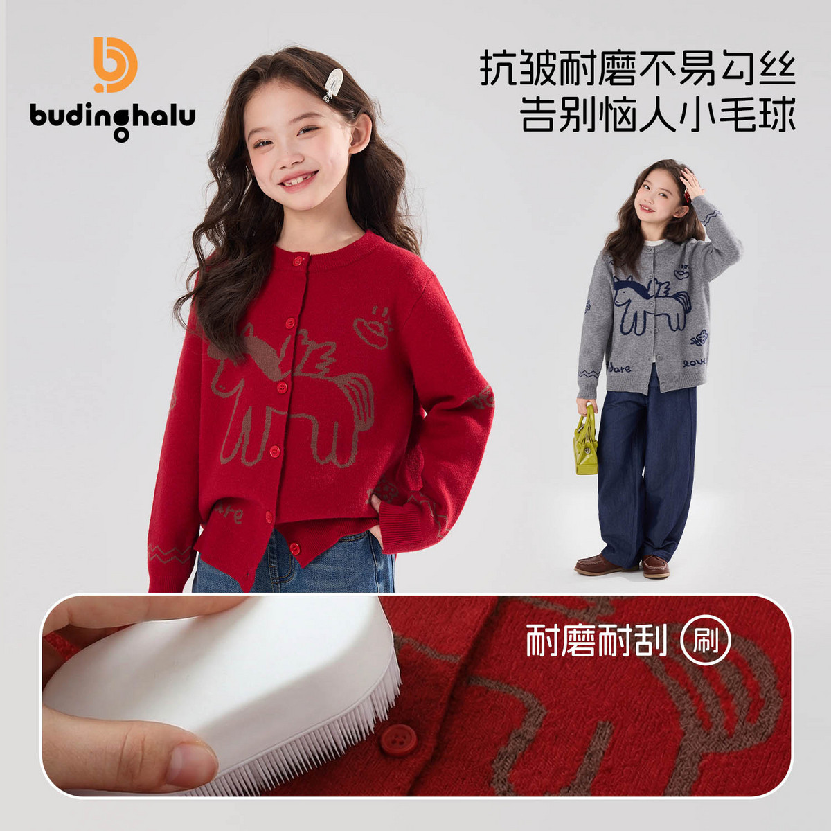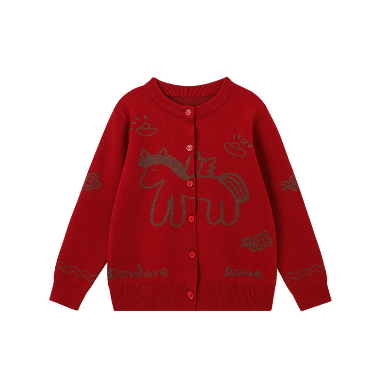 布丁哈鲁拜年服红色小马针织开衫2026春季女童装毛衣外套毛衫上衣