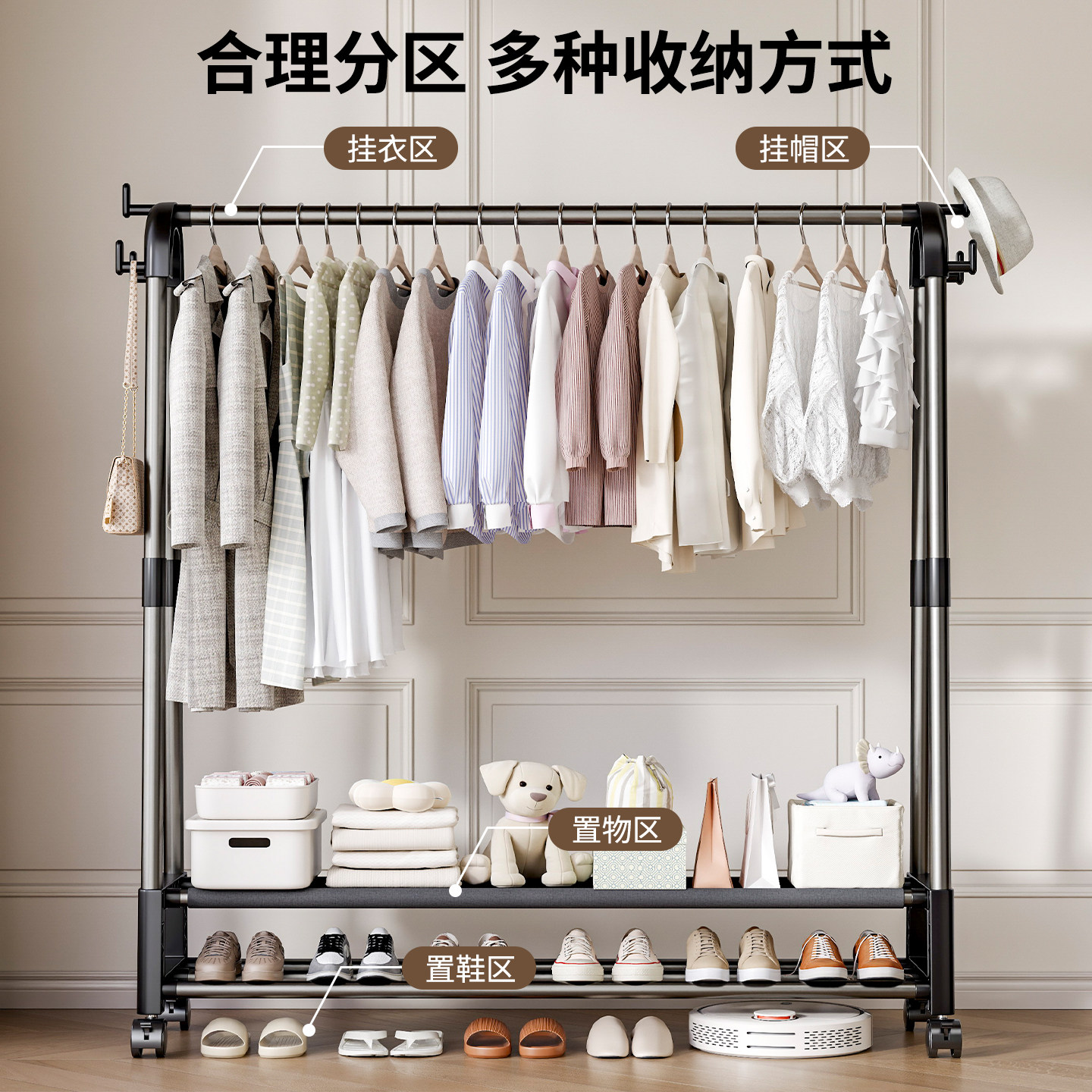 挂衣架落地卧室家用房间室内双杆晾晒衣服架子可移动多功能衣帽架