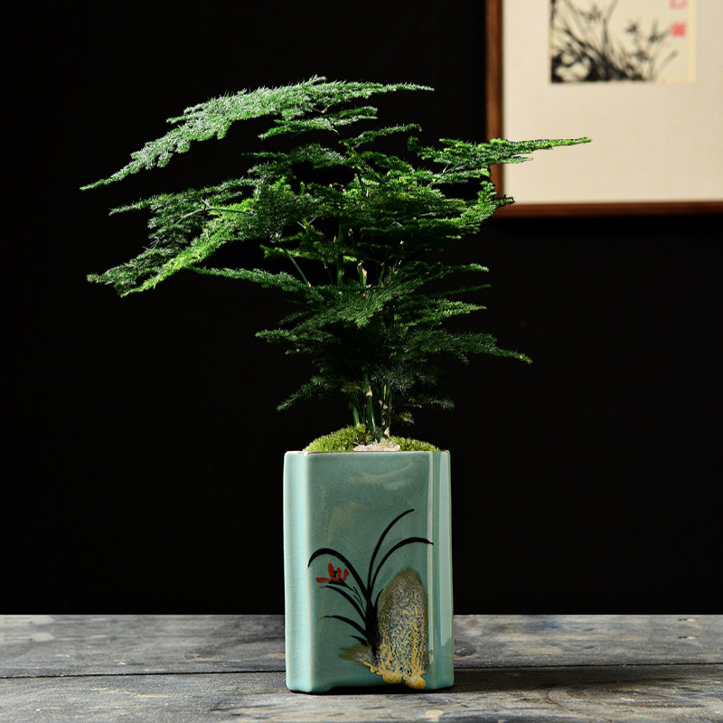四方形青瓷手绘花盆陶瓷紫砂绿植文竹盆栽小号室内中国风小老桩盆