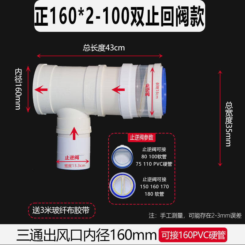 斜三通160带止逆阀止回阀PVC管110变径75排风软管180Y型油烟机管