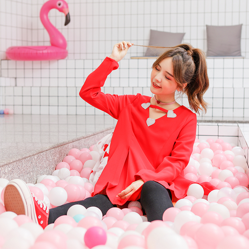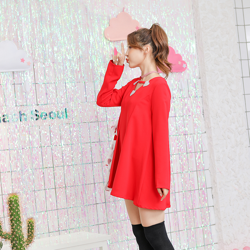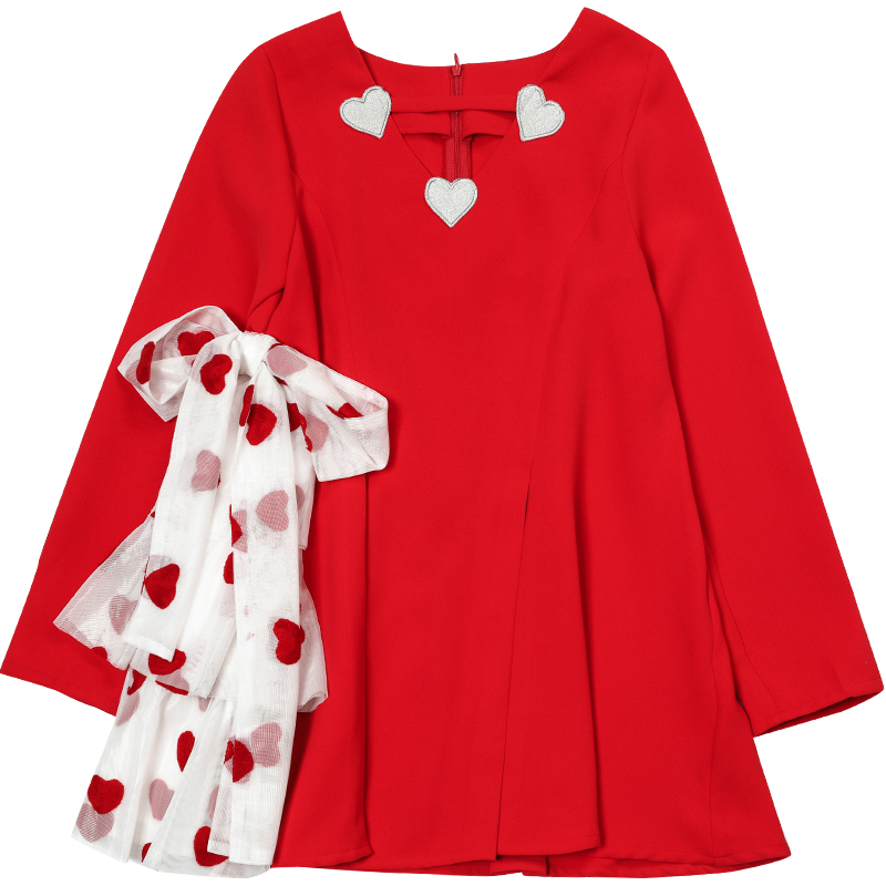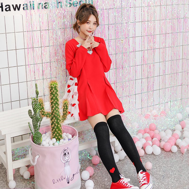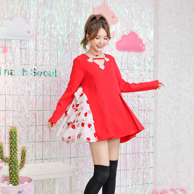 春装甜美可爱日系心形刺绣网纱荷叶边下摆蝴蝶结不对称红色连衣裙