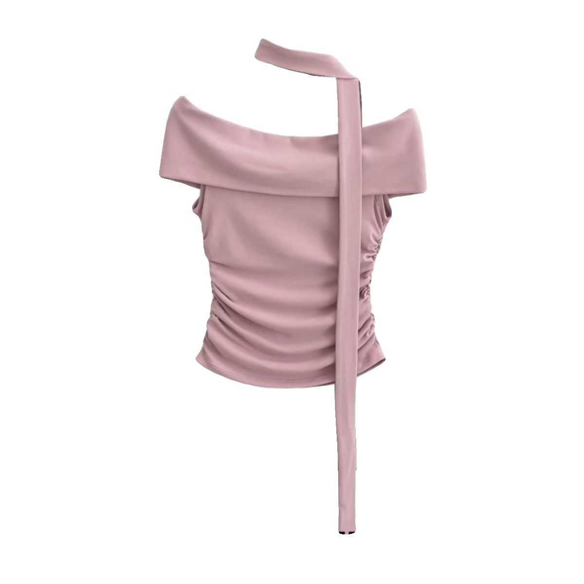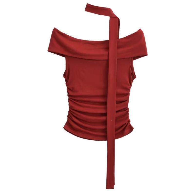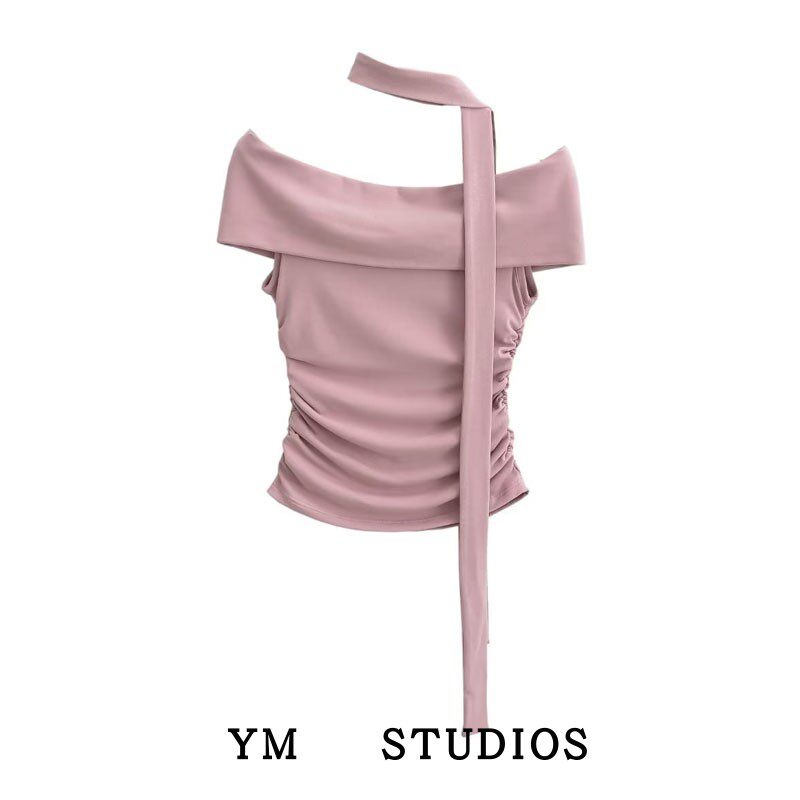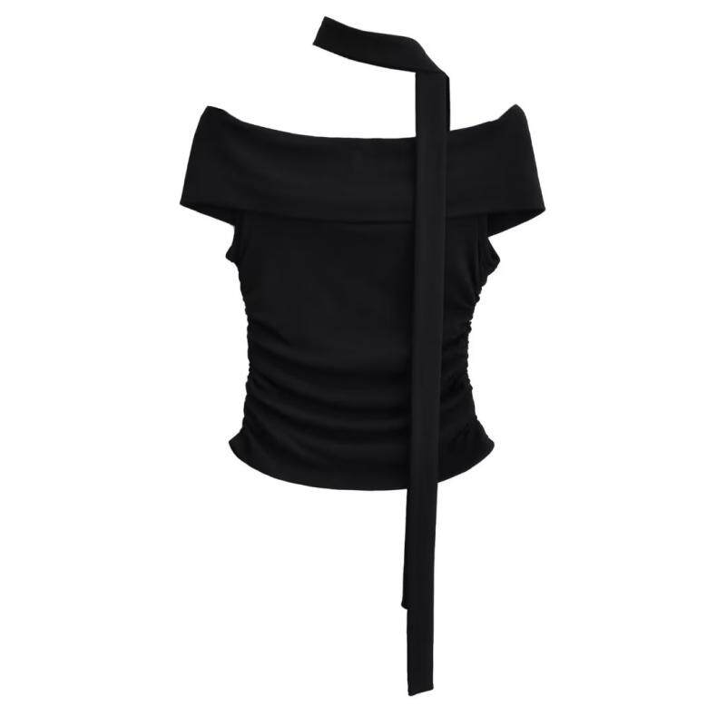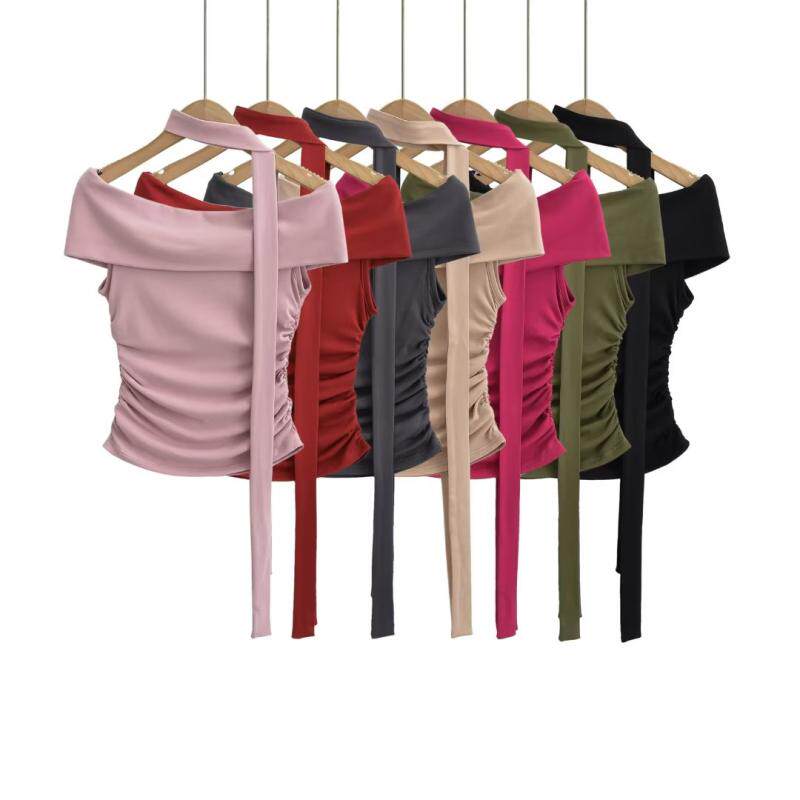 【包邮】辣妹设计感翻领褶皱紧身T恤+颈饰围巾短款性感千禧女上衣