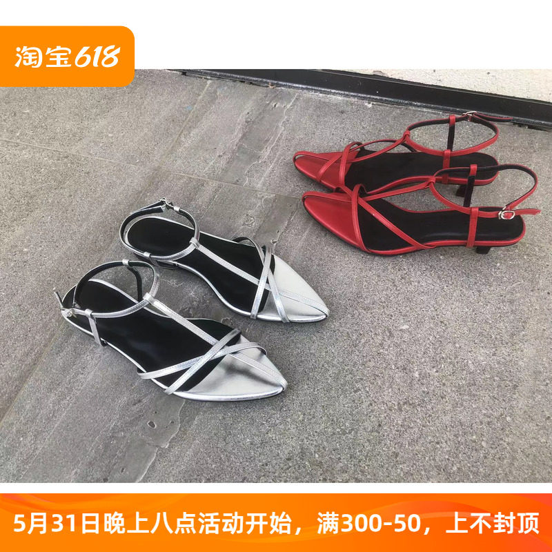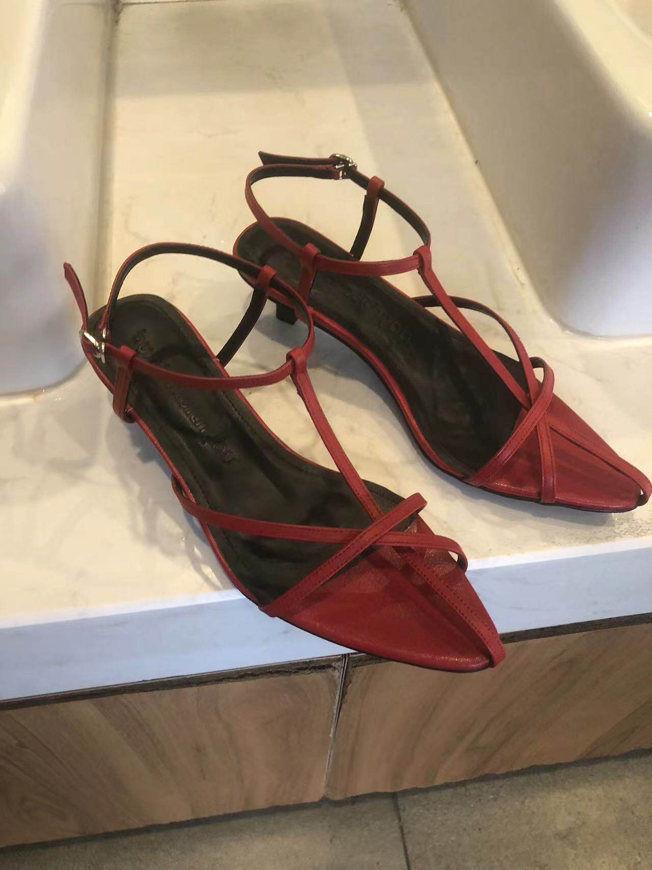 尖头凉鞋女外穿真皮手工鞋24夏季新款气质红色中跟一字式扣带女鞋