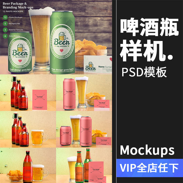 啤酒酒类品牌易拉罐瓶子复古风格包装贴图样机PSD模板PS设计素材