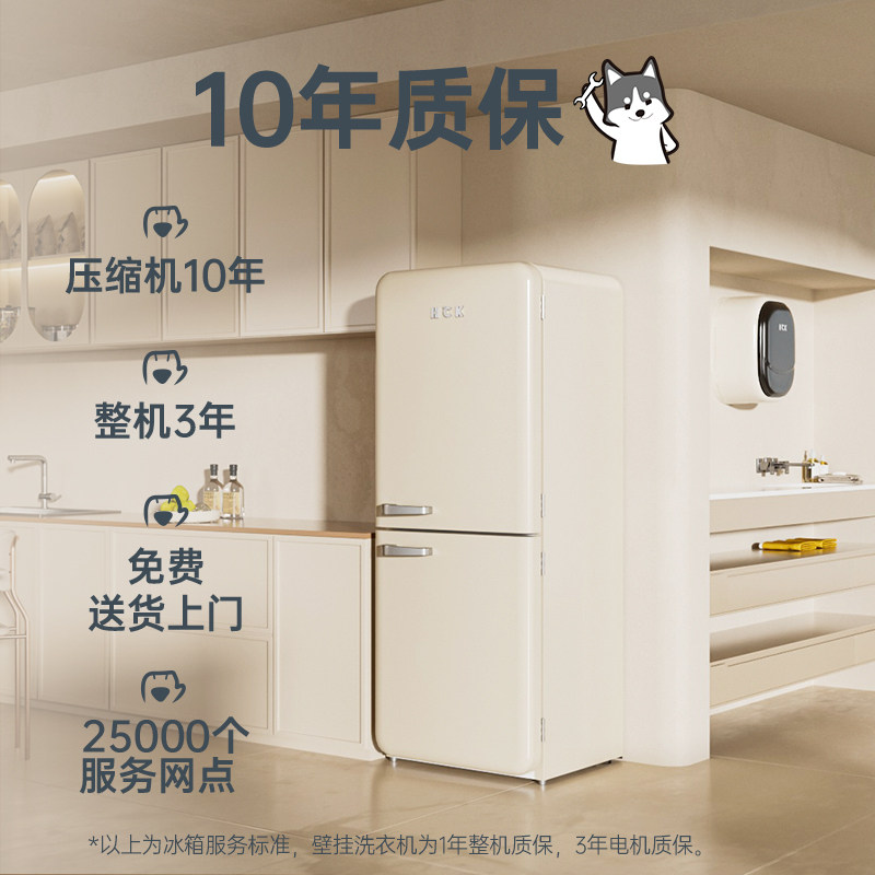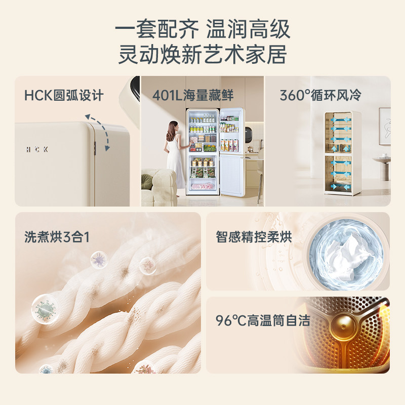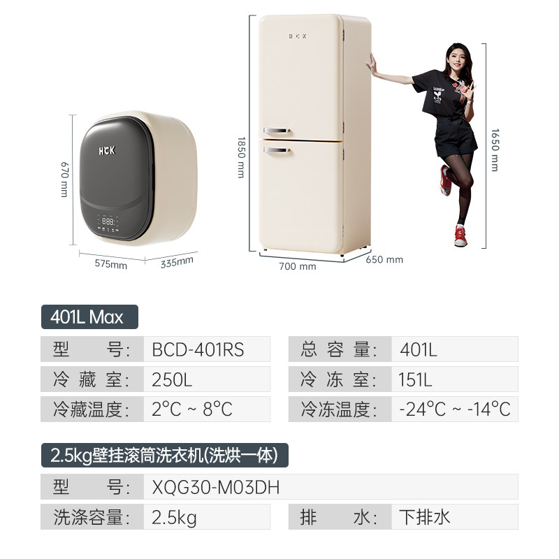 HCK哈士奇冰洗烘套装401LMax双门复古冰箱+洗烘壁挂洗衣机