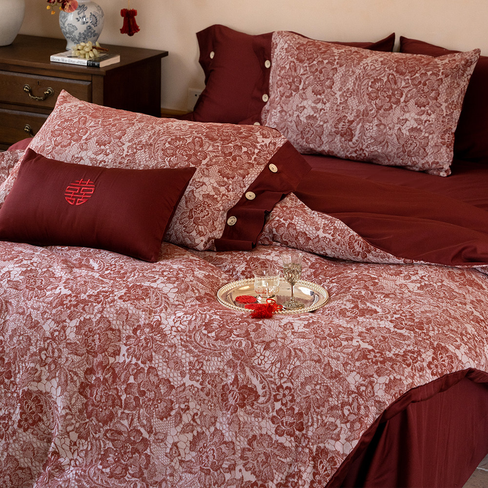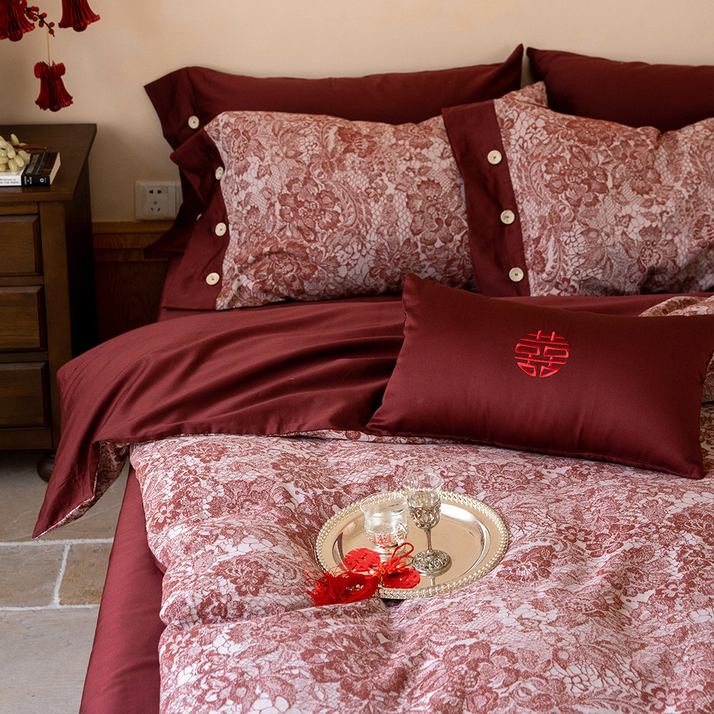 在耳边轻奢60s色织全棉大红婚庆床品套件喜庆结婚陪嫁四件套