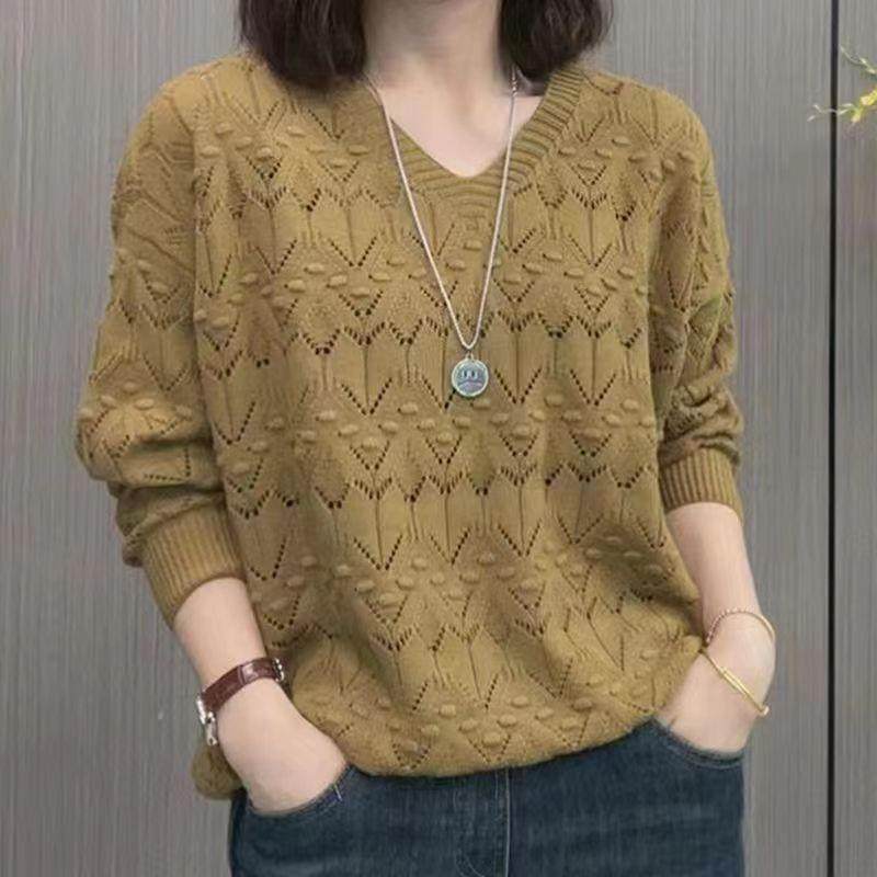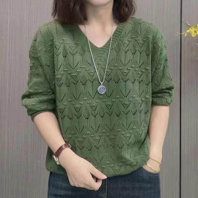 早春女装2025新款V领长袖针织衫时尚洋气百搭毛衣女士镂空上衣潮