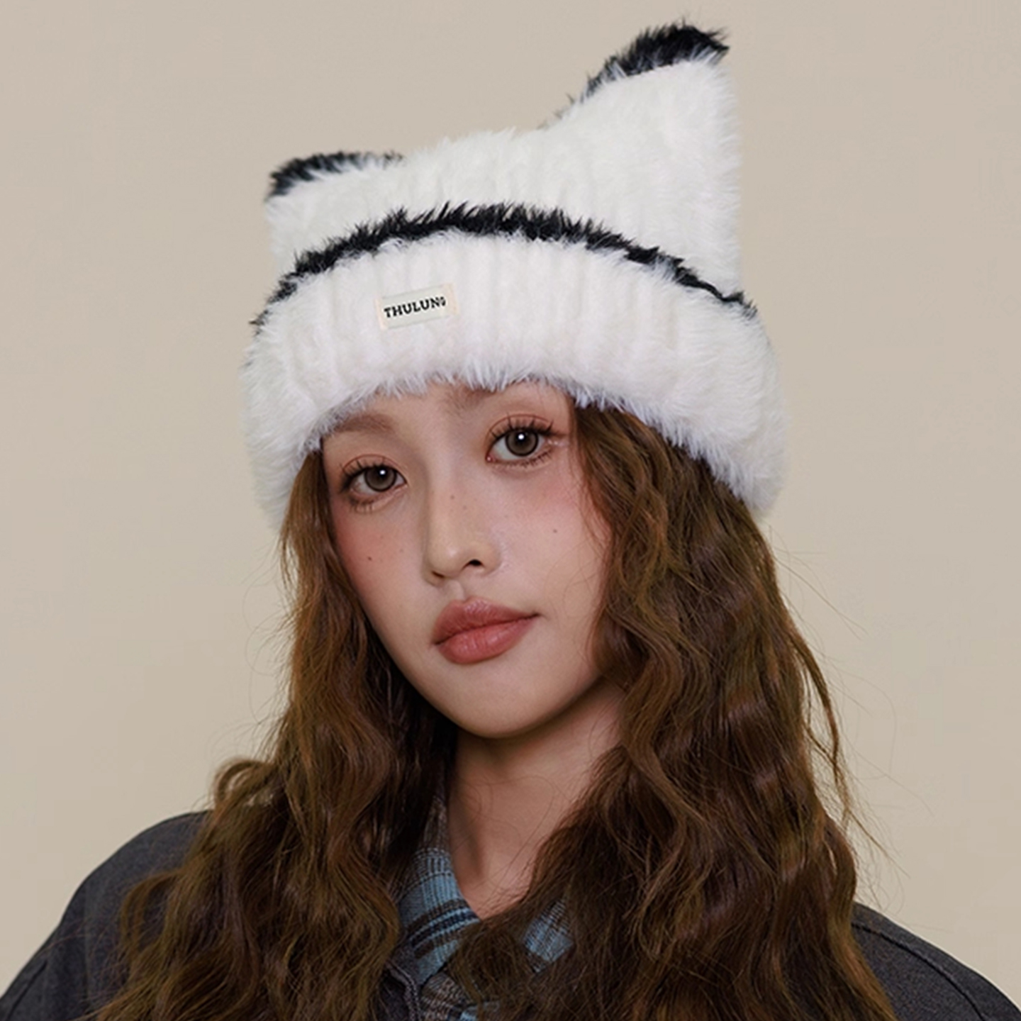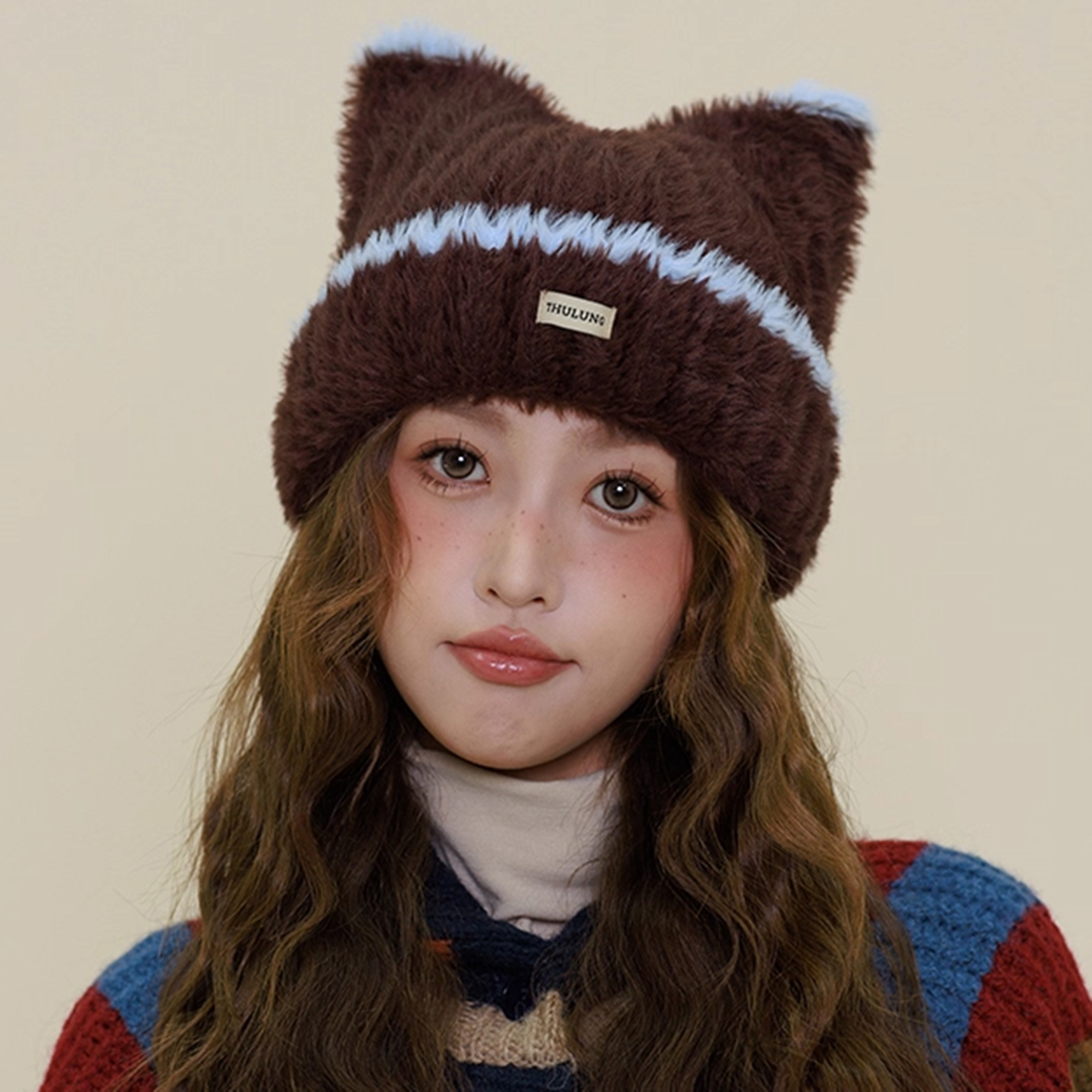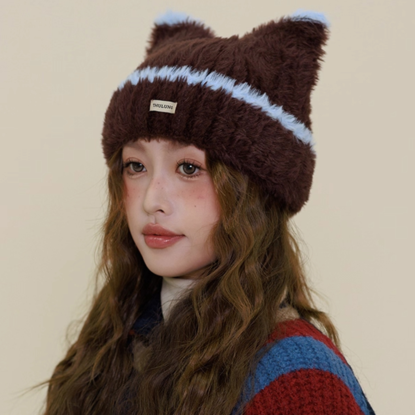 日系可爱拼色猫耳毛绒针织帽子女冬季保暖防寒护耳毛线帽套头帽潮