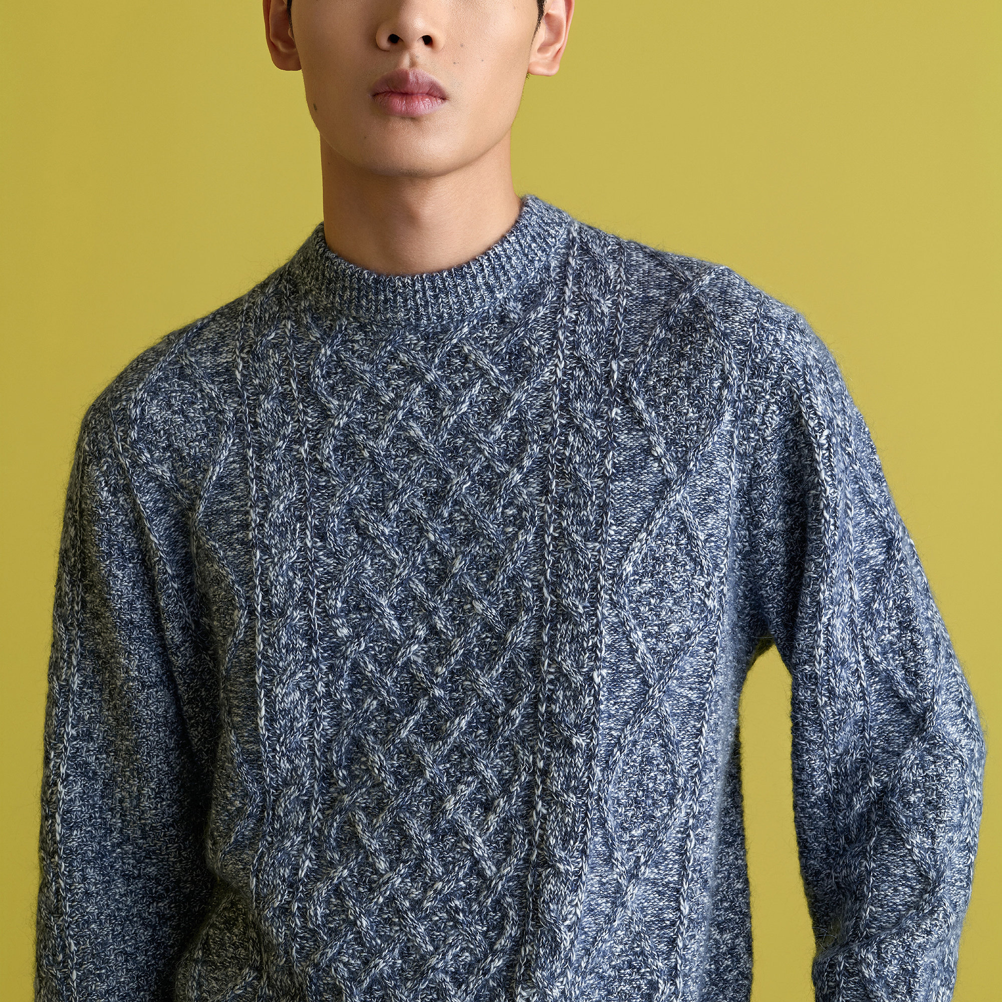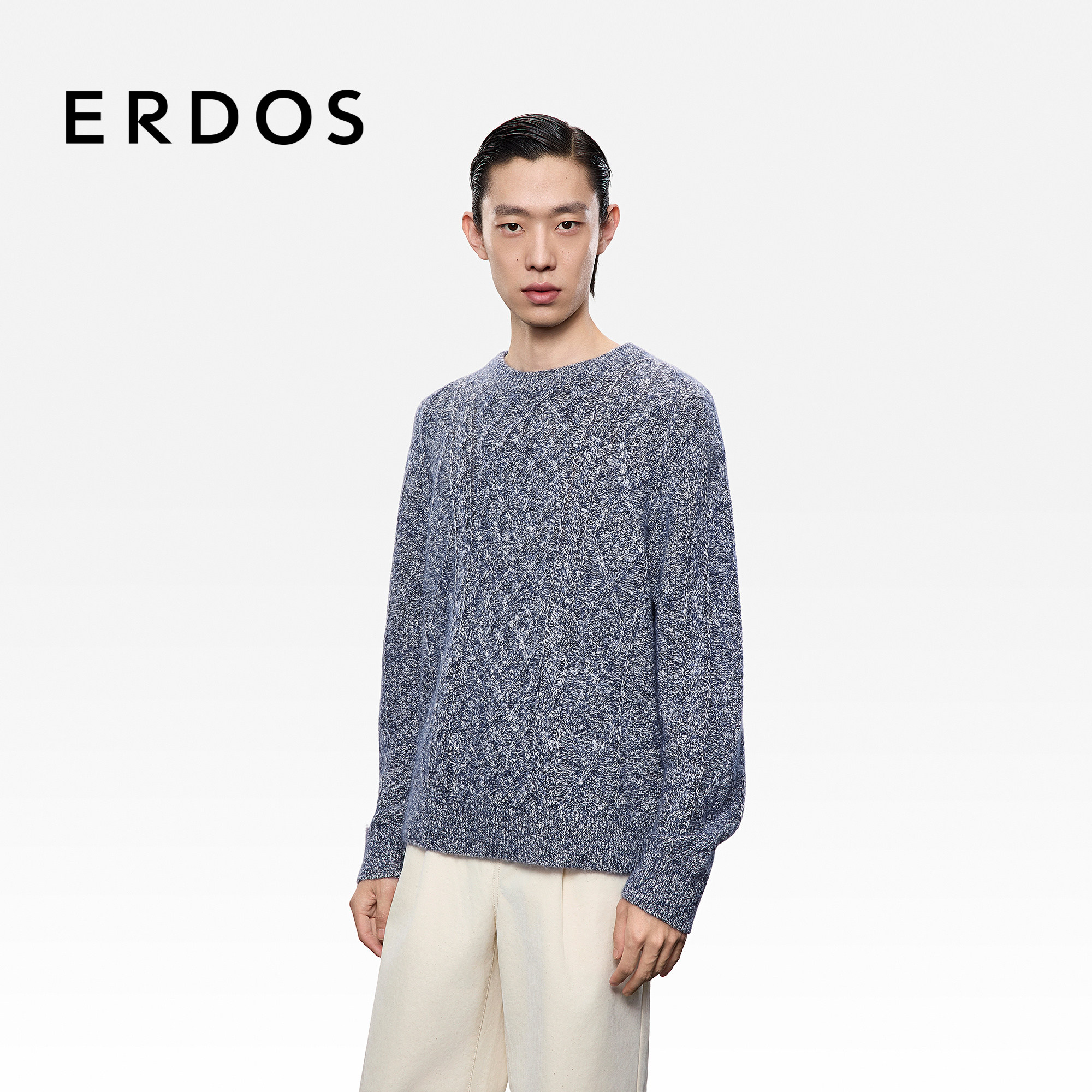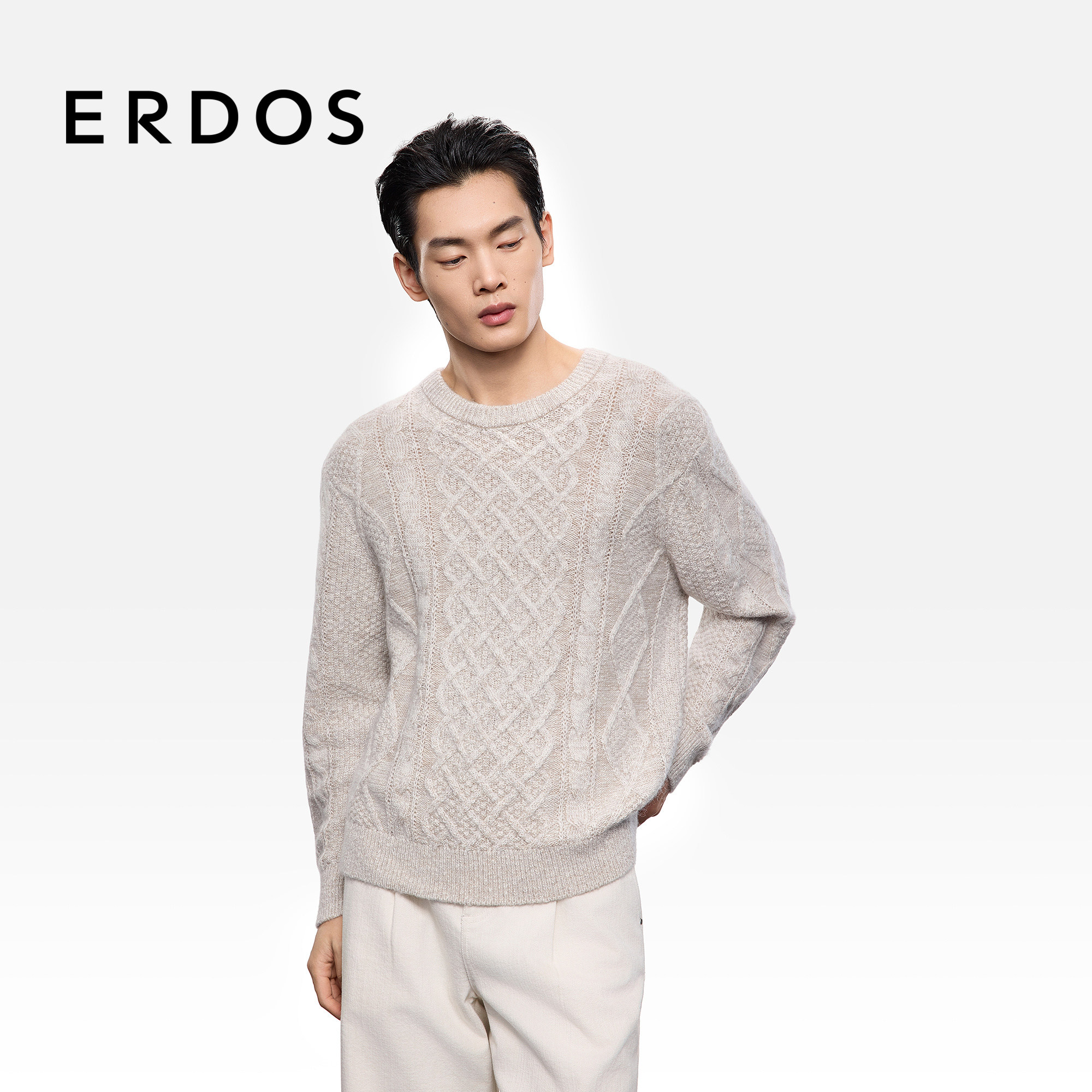 ERDOS 男装丝毛绒混纺圆领绞花羊绒衫25年秋冬新品保暖套衫