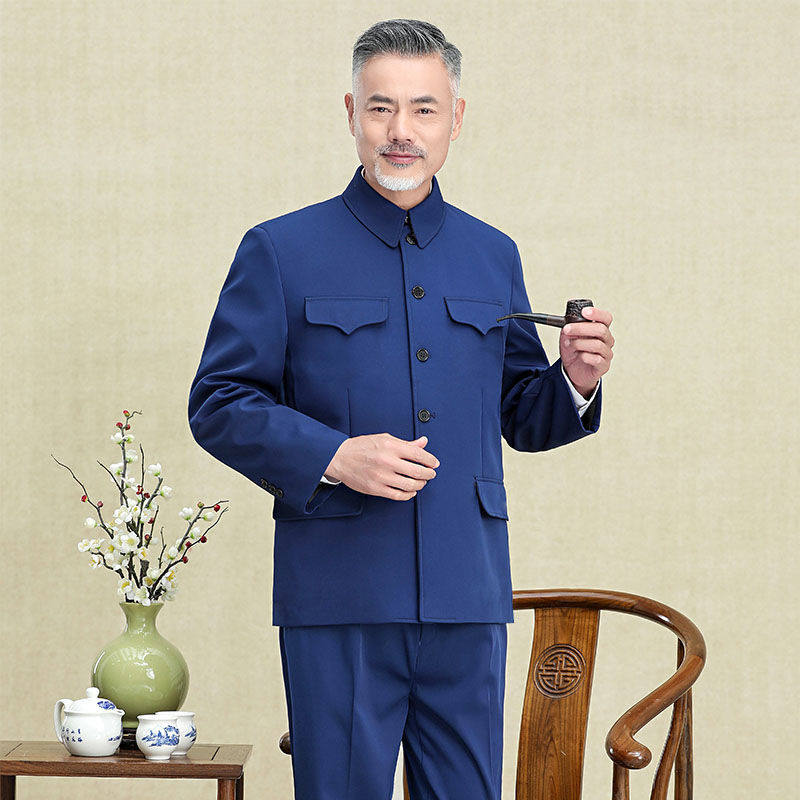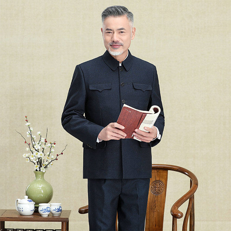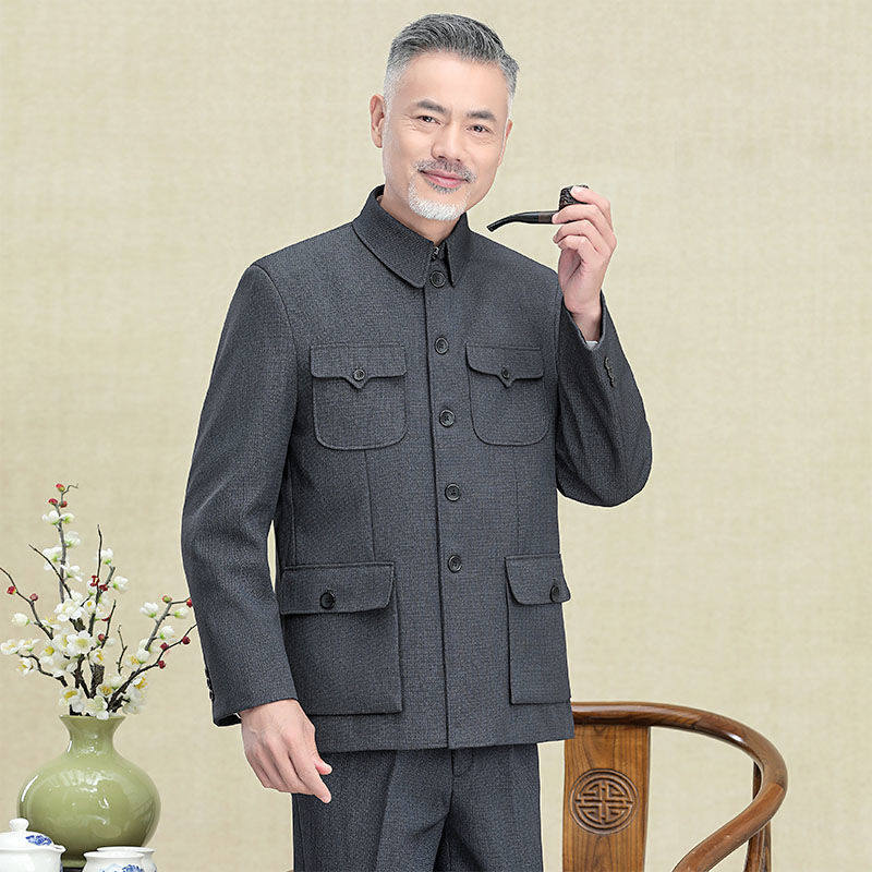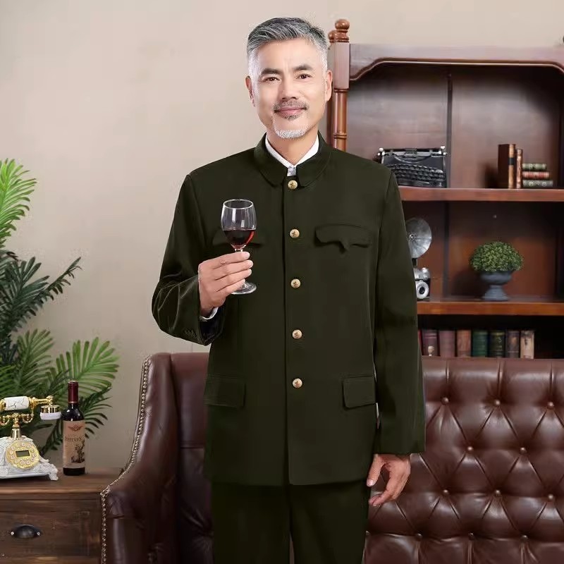 中老年中山装套装军绿色春秋上衣男老年人中山服爸爸装中国风男装