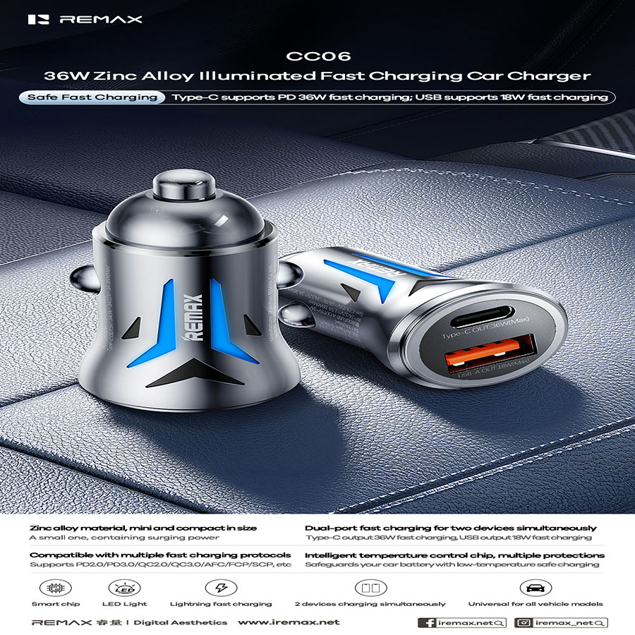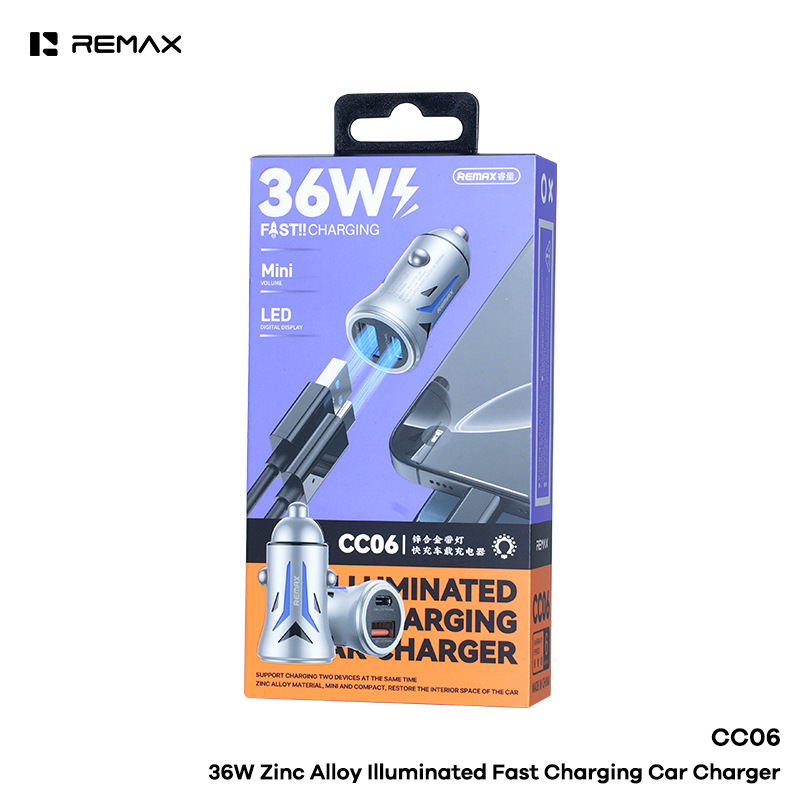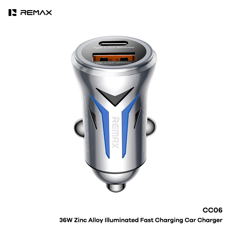 REMAX 睿量 PD36W 锌合金带灯快充车载充电器 Type-C/USB CC06