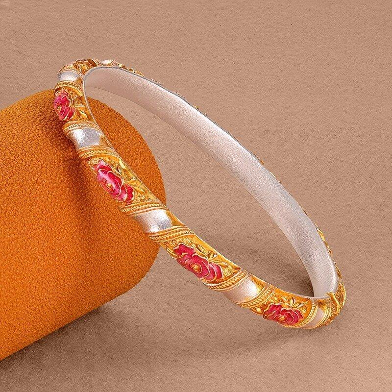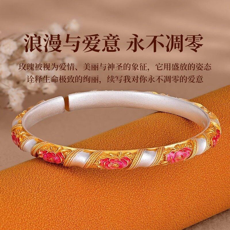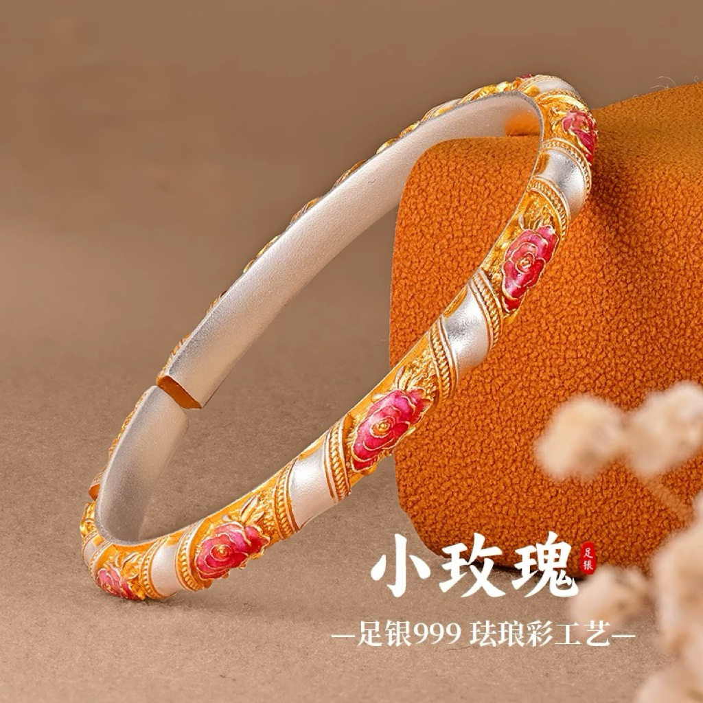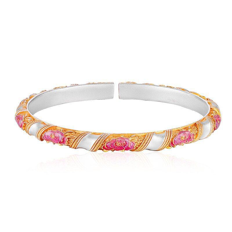足银9999小玫瑰花足珐琅彩描金开口实心银手镯流行首饰时尚饰品新