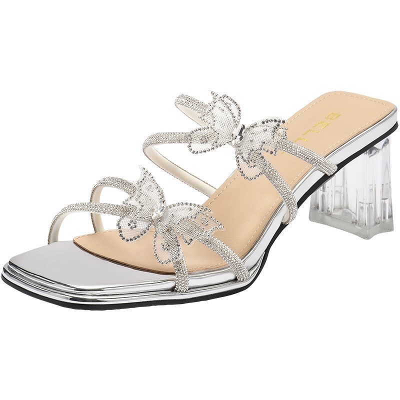 百丽女鞋法式粗高跟一字拖女夏季新款可外穿绝美凉鞋子B2641BT5