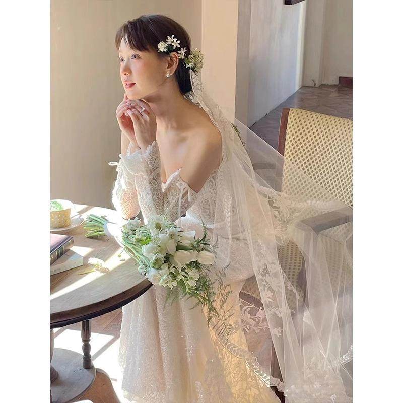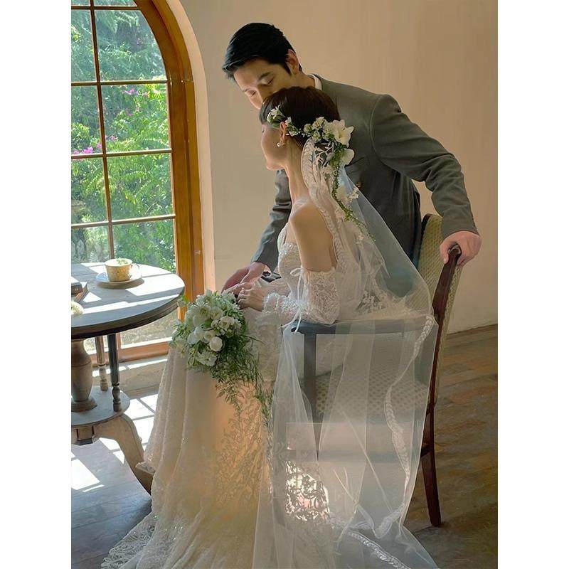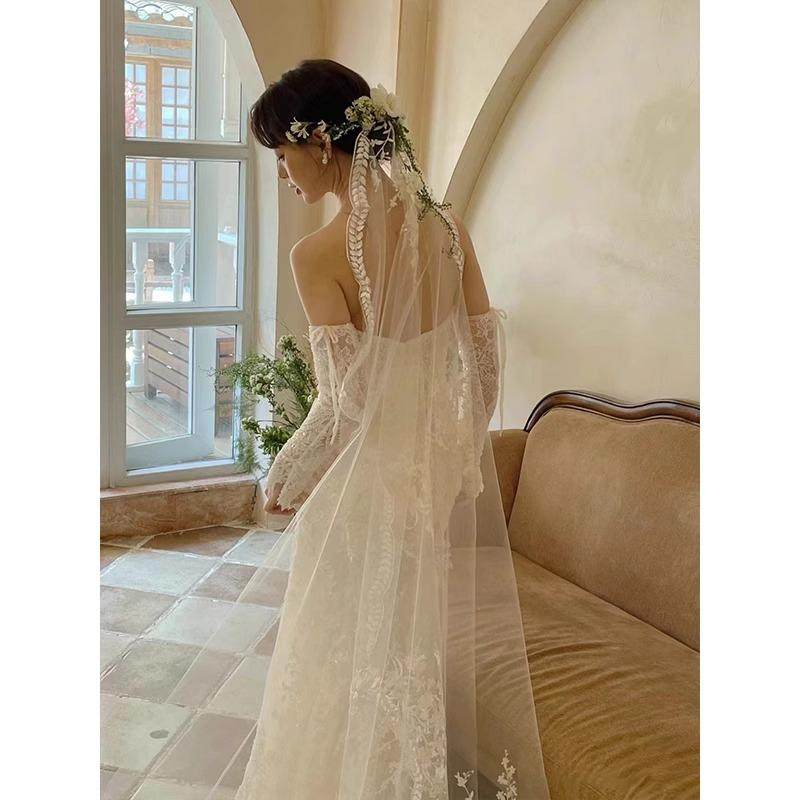 重工蕾丝超仙头纱森系高级感造型婚纱拍照道具新娘结婚拖尾头饰